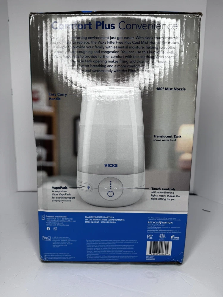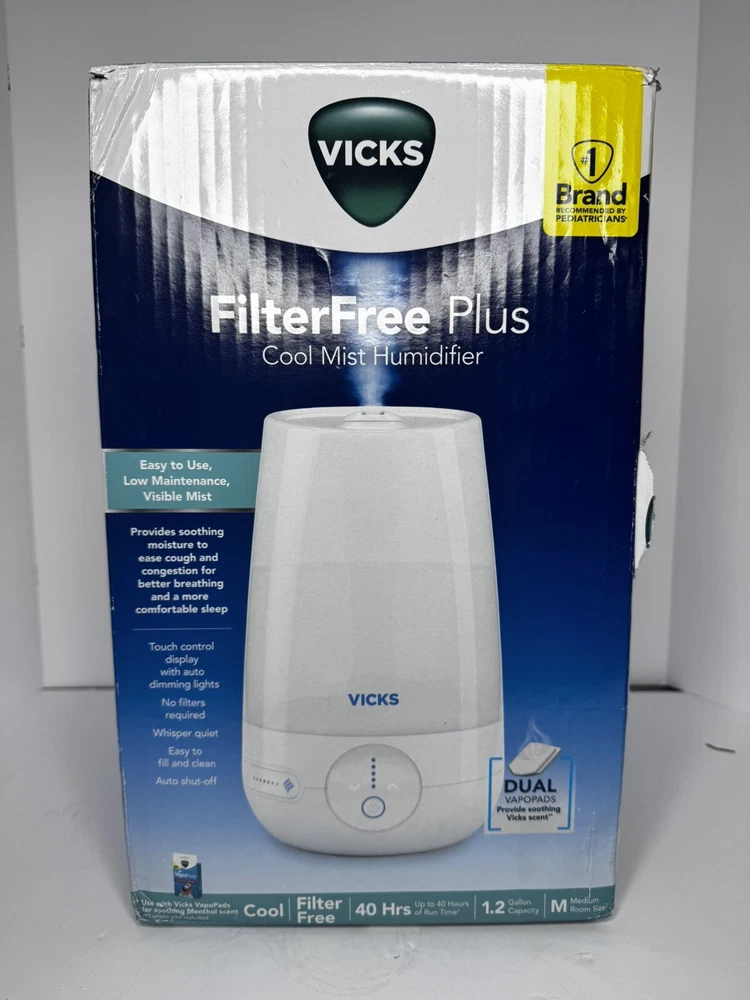 This Vicks Filter Free Plus Cool Mist Ultrasonic Humidifier is the perfect addition to any room. With a coverage area of 100 sq ft and a 1.2gal capacity, it is ideal for large spaces. The humidification method is ultrasonic, which ensures quiet operation while maintaining the desired humidity level. The unit is designed with adjustable humidity control, allowing you to customize the environment to your liking. The Vicks V5100NS model is made of durable plastic and has a glossy finish that will complement any decor. This humidifier is suitable for any room in your home and is easy to use.