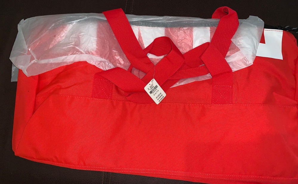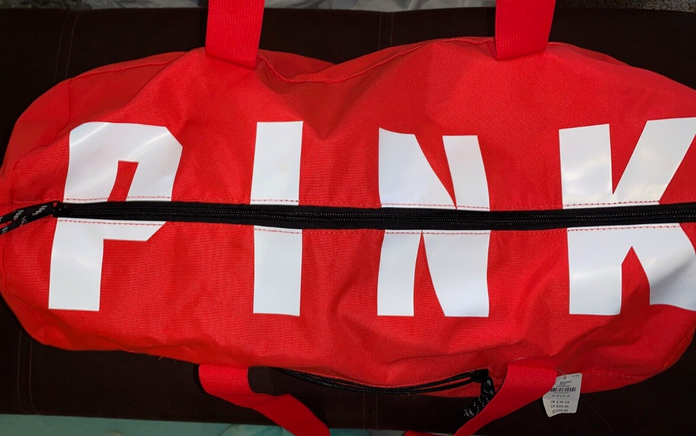 This is a Victoria Secret PINK duffle bag in a vibrant red color with the brand's logo pattern. It is a large size bag made of cotton material with a zip closure, featuring red handles/straps and black hardware. Perfect for travel, the bag has a stylish and eye-catching design, ideal for women who love the PINK brand.