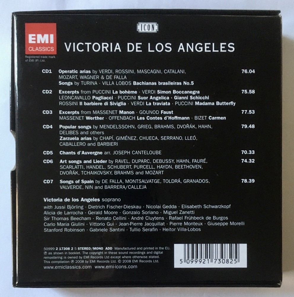 CD1 Operatic arias by VERDI, ROSSINI, MASCAGNI, CATALANI, MOZART, WAGNER & DE FALLA 76.04 Songs by TURINA VILLA LOBOS Bachianas brasileiras No.5 CD2 Excerpts from PUCCINI La bohème VERDI Simon Boccanegra LEONCAVALLO Pagliacci PUCCINI Suor Angelica Gianni Schicchi ROSSINI II barbiere di Siviglia VERDI La traviata PUCCINI Madama Butterfly 75.58 CD3 Excerpts from MASSENET Manon GOUNOD Faust 77.53 MASSENET Werther OFFENBACH Les Contes d'Hoffmann BIZET Carmen CD4 Popular songs by MENDELSSOHN, GRIEG, BRAHMS, DVOŘÁK, HAHN, DELIBES and others 79.48 Zarzuela arias by CHAPI, GIMÉNEZ, CHUECA, SERRANO, LLEÓ, CABALLERO and BARBIERI CD5 Chants d'Auvergne arr. JOSEPH CANTELOUBE 70.33 CD6 Art songs and Lieder by RAVEL, DUPARC, DEBUSSY, HAHN, FAURÉ, SCARLATTI, HANDEL, SCHUBERT, PURCELL, HAYDN, BEETHOVEN, DVOŘÁK, TCHAIKOVSKY, BRAHMS and MOZART 74.32 CD7 Songs of Spain by DE FALLA, MONTSALVATGE, TOLDRÁ, GRANADOS, VALVERDE, NIN and BARRERA/CALLEJA 78.39 Victoria de los Angeles soprano with Jussi Björling Dietrich Fischer-Dieskau Nicolai Gedda Elisabeth Schwarzkopf Alicia de Larrocha Gerald Moore Gonzalo Soriano Miguel Zanetti Sir Thomas Beecham Renato Cellini André Cluytens Rafael Frühbeck de Burgos Carlo Maria Giulini. Vittorio Gui Jean-Pierre Jacquillat Pierre Monteux Giuseppe Morelli Stanford Robinson Gabriele Santini Tullio Serafin. Heitor Villa-Lobos