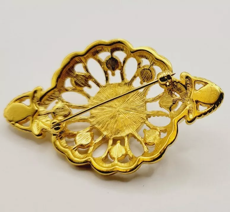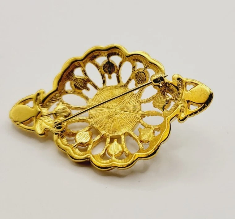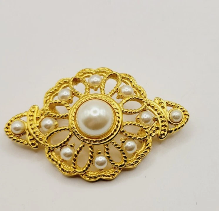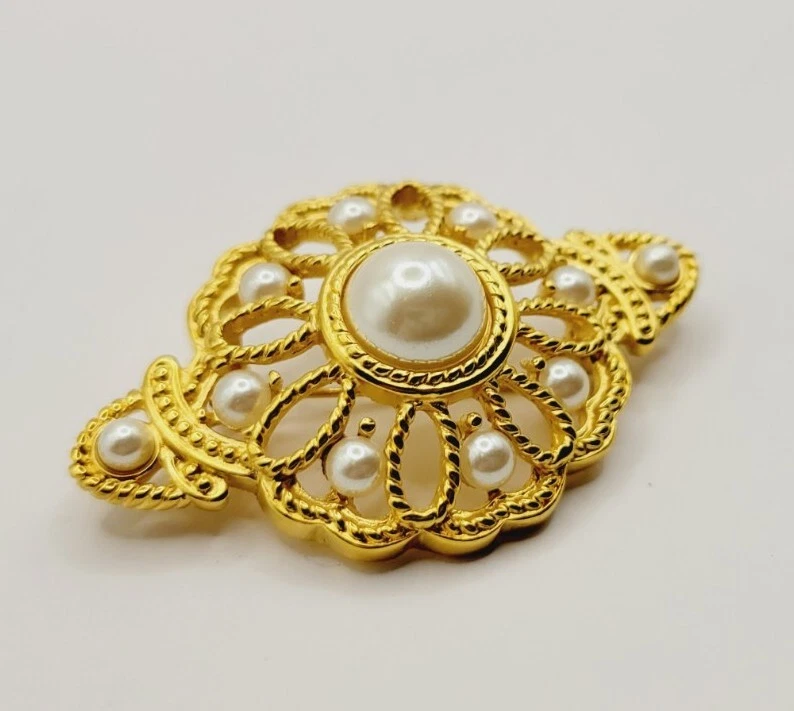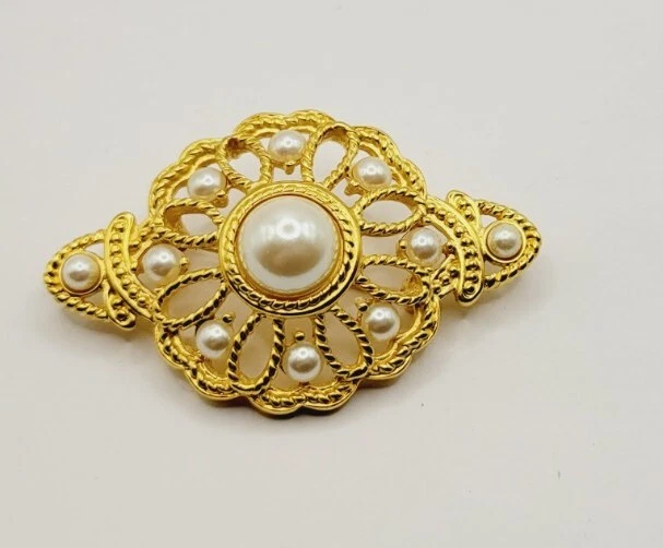 Victorian Brooch Gold tone Faux Pearl Floral Vintage Ornate