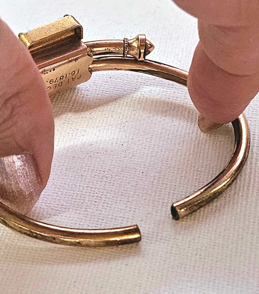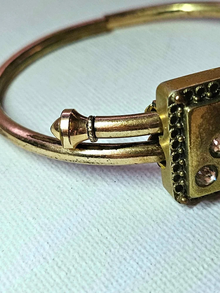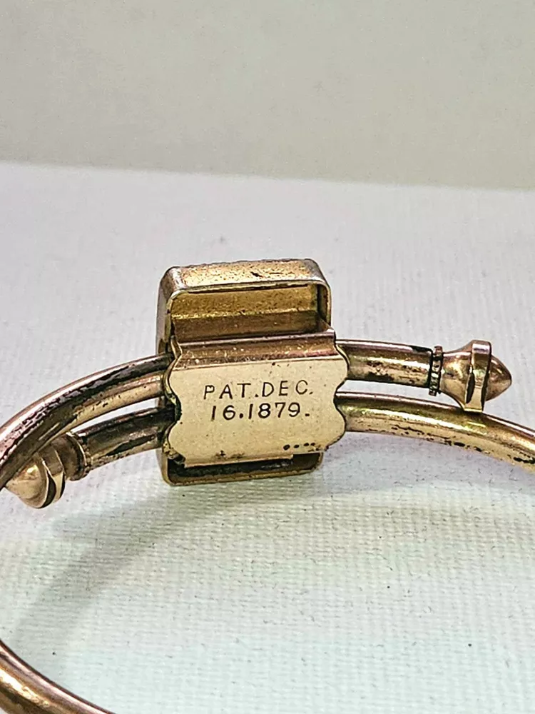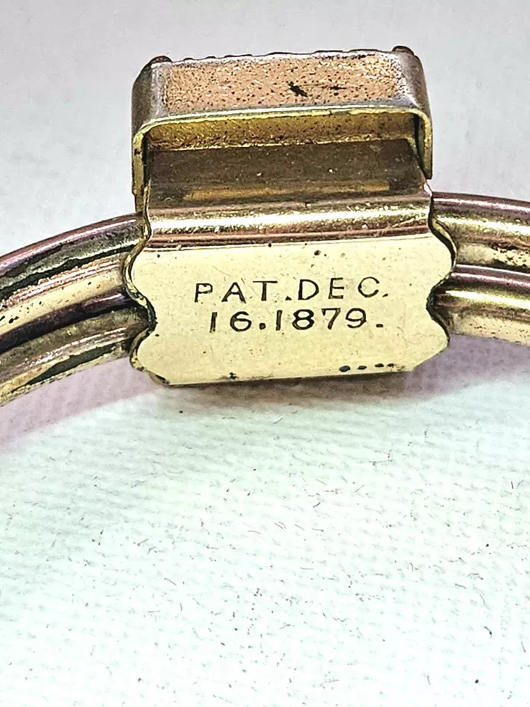 Antique Victorian Hinged Cuff Bracelet Stamped Dec. 16.1879 Gold P Please look at all photos Some normal wear considering age Feel free to Google Lens my images to find Comps. Thanks for looking!