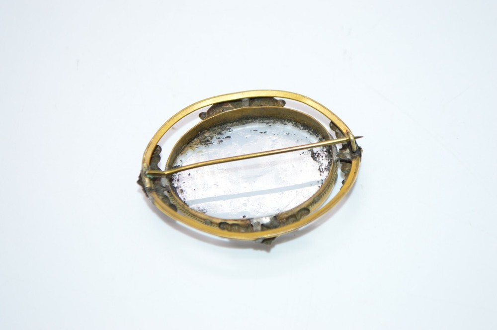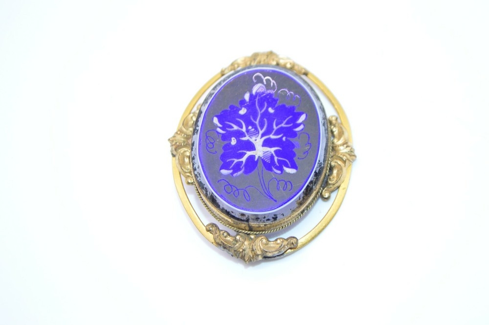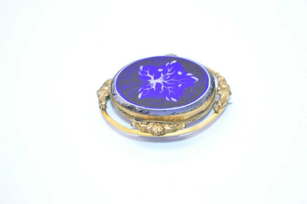 Victorian Gold Filled Blue White Glass Hand Painted Large Brooch C Clasp Please see pics for condition 2 by 1 & 5/8"