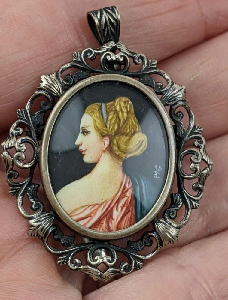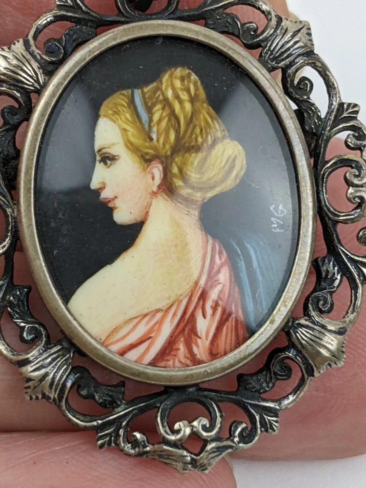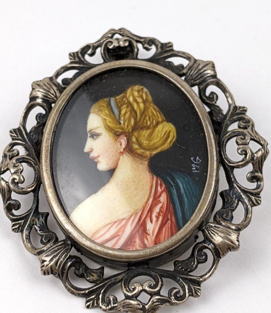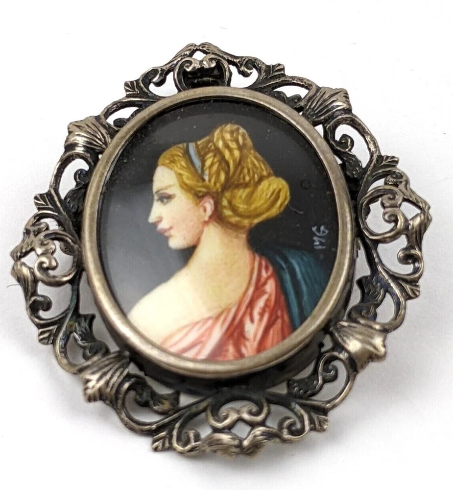 Beautiful antique Art Nouveau early 1900s Hand Painted Portrait Brooch or Pendant combination. The Oval portrait is hand painted and artist signed MG?. It is under a glass crystal and mounted in a wonderful 800 silver filigree frame. This is most likely Italian in origin. It has a locking pin mechanism and a hand chased bail to wear as a pendant. It is clearly marked for 800 silver. The brooch measures 1 3/4" by 1 3/8" and is in excellent well cared for estate condition. The frame has the original appropriate patina. 3202