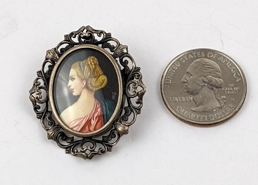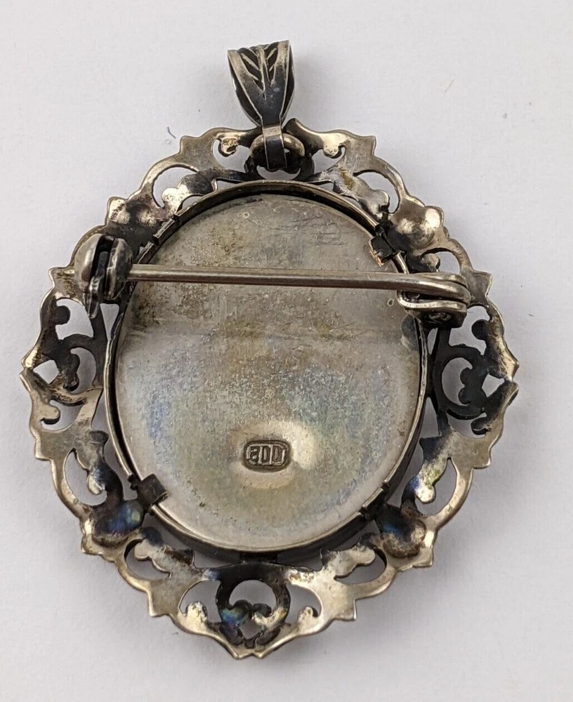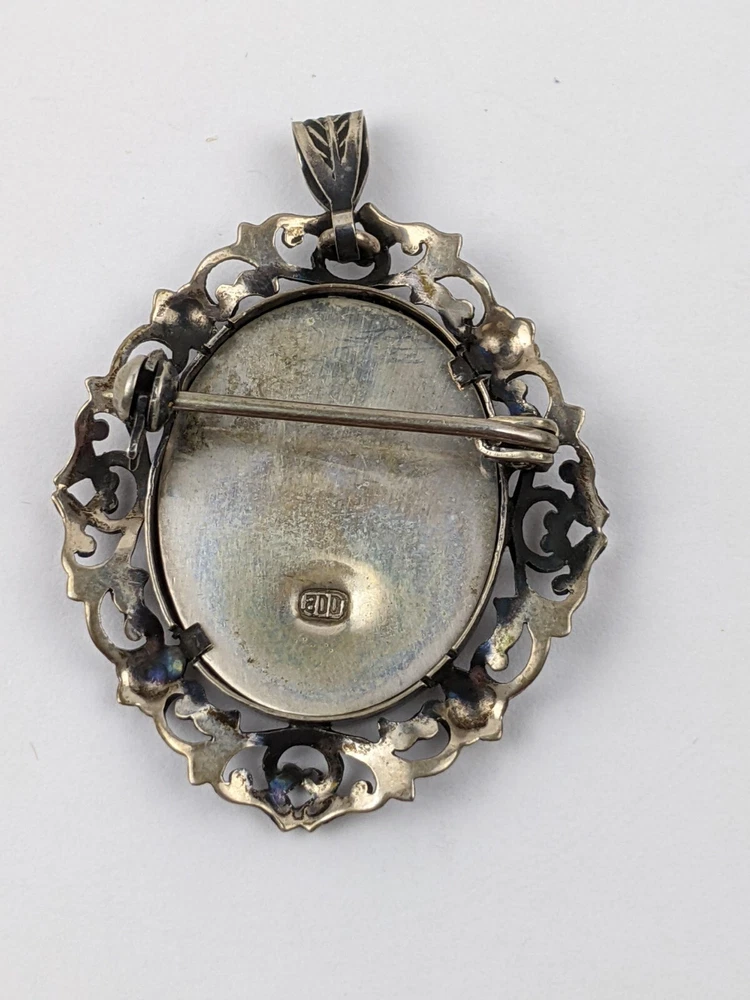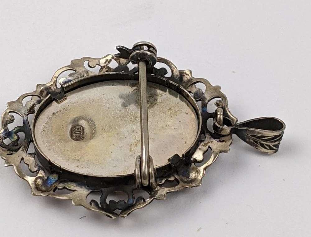 Beautiful antique Art Nouveau early 1900s Hand Painted Portrait Brooch or Pendant combination. The Oval portrait is hand painted and artist signed MG?. It is under a glass crystal and mounted in a wonderful 800 silver filigree frame. This is most likely Italian in origin. It has a locking pin mechanism and a hand chased bail to wear as a pendant. It is clearly marked for 800 silver. The brooch measures 1 3/4" by 1 3/8" and is in excellent well cared for estate condition. The frame has the original appropriate patina. 3202