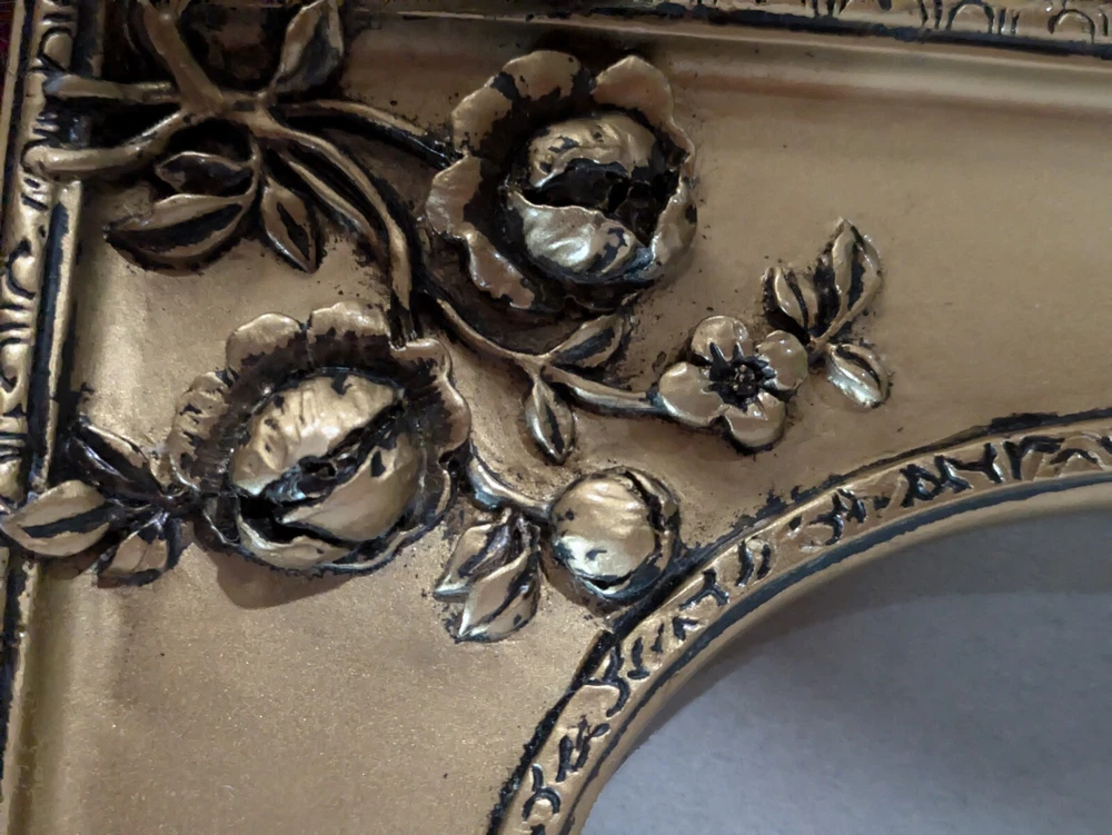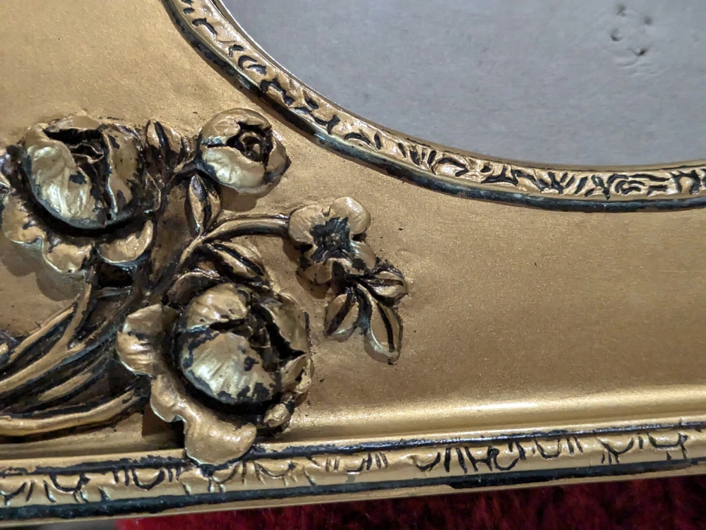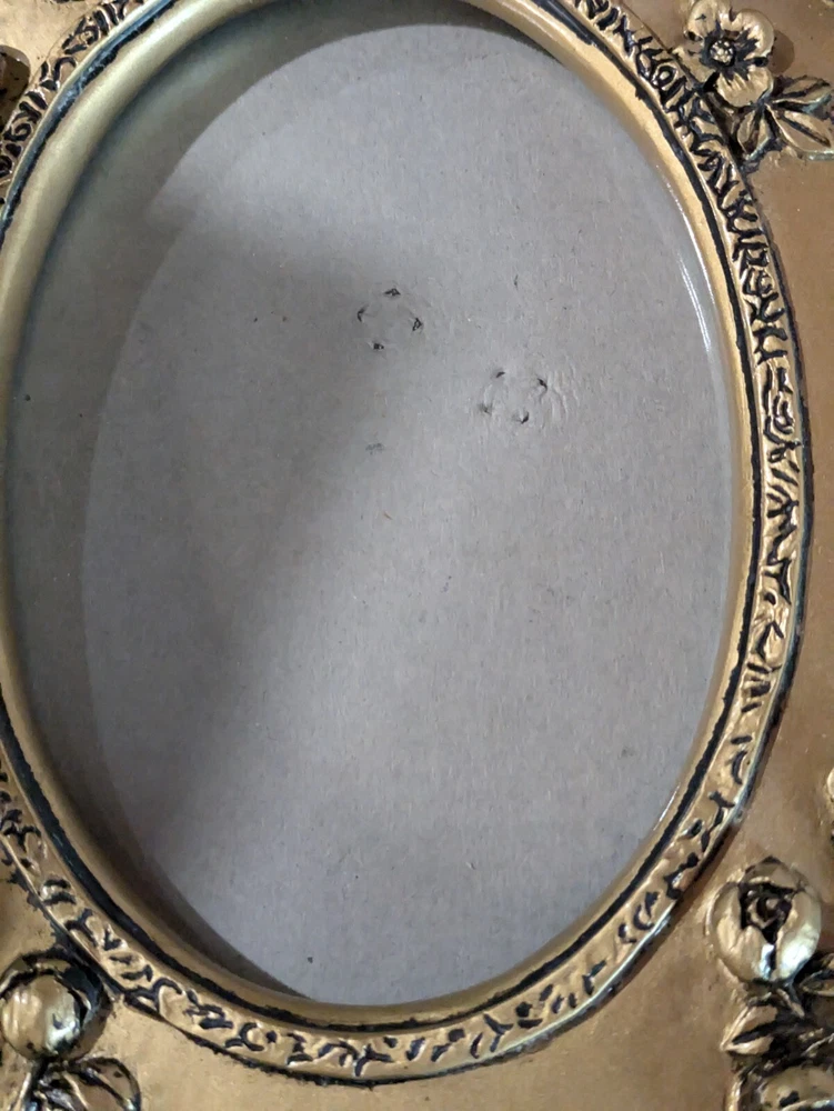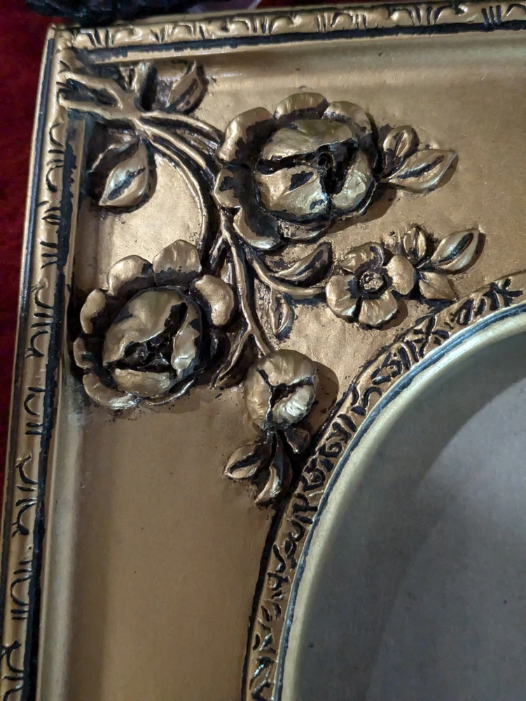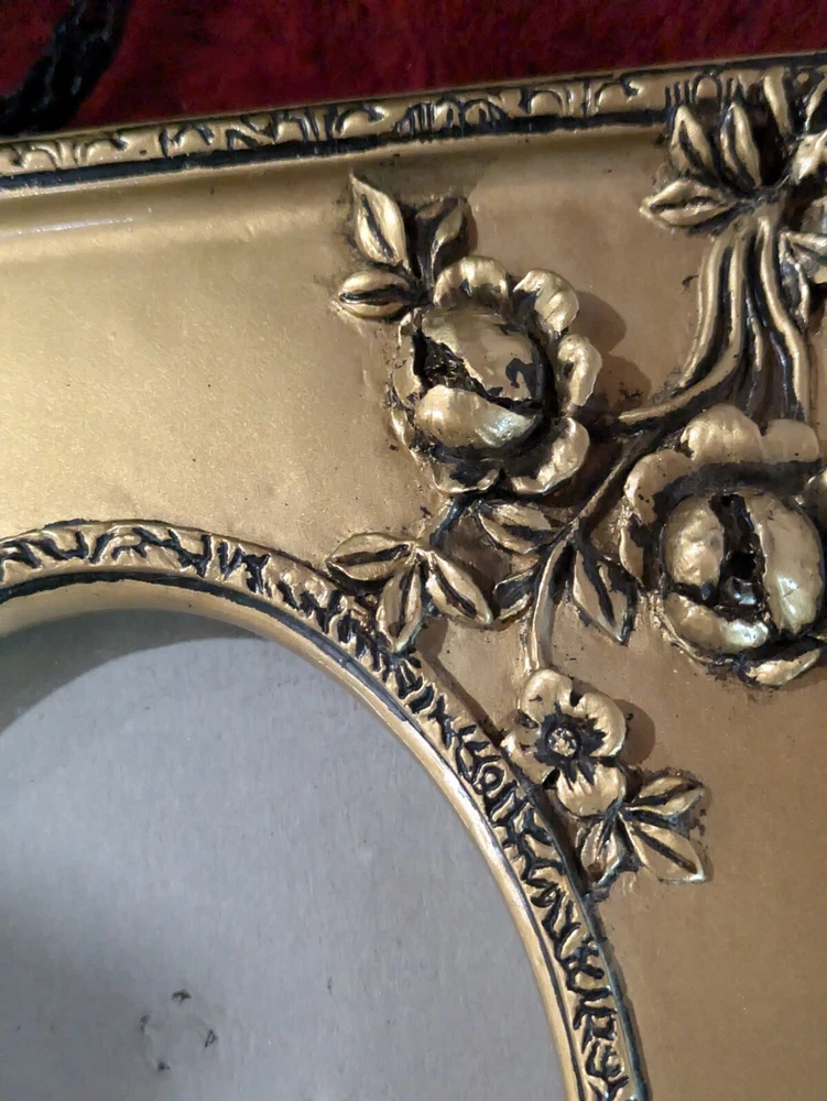 Add a touch of elegance to your home decor with this beautiful Victorian-style picture frame. The frame features intricate gold leaf paint with raised roses and a scroll pattern. The rectangle/oval shape and portrait/landscape orientation make it a versatile piece for any occasion. Crafted from plaster material, this original frame is 8.5 inches in height and 6.75 inches in width. It has an antique-inspired decor. theme. Get this stunning piece today to add a touch of sophistication to your collection. Oval spot for a picture is 4 5/8 x 6.25". Very good condition.