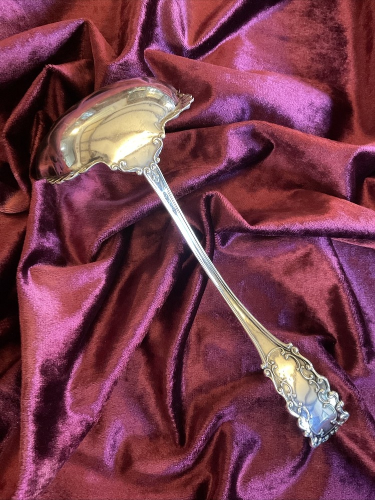 VICTORIA (old) by Watson Silver. First made in 1890 and long discontinued. Heavy, at 167 grams, 10” soup ladle with a 4 ounce crenellated bowl. Monogram of gothic “S” As there is little on the market like this so I am going to start high and see what happens.