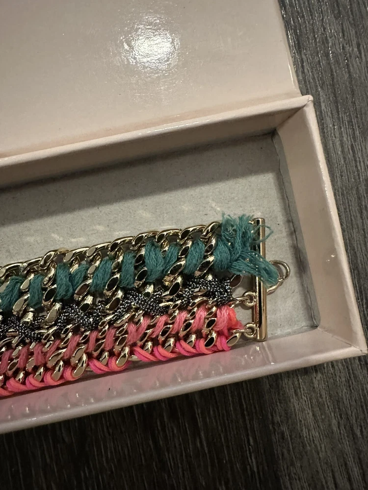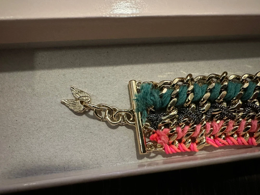 This Victoria's Secret Gold Multi Color Gold Chain Key Fob Key Chain is the perfect accessory for any woman. Made of durable metal material, this key chain features a beautiful multicolor design that will surely catch the eye of anyone who sees it. The key chain is perfect for keeping your keys organized and easy to find, while also adding a touch of style to your everyday look. It is suitable for any department, especially for women's accessories. The key chain is a great gift for any Victoria's Secret fan or anyone who loves stylish and trendy accessories.