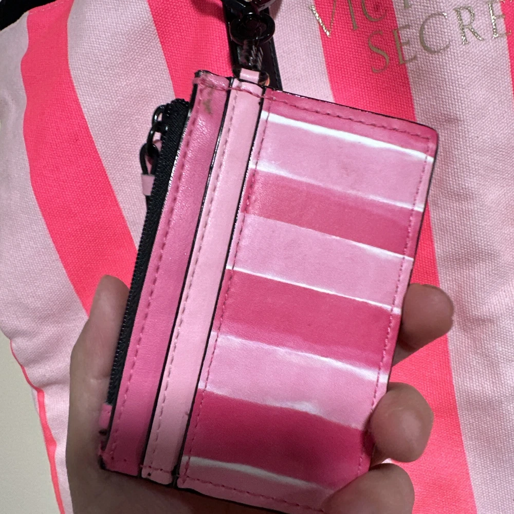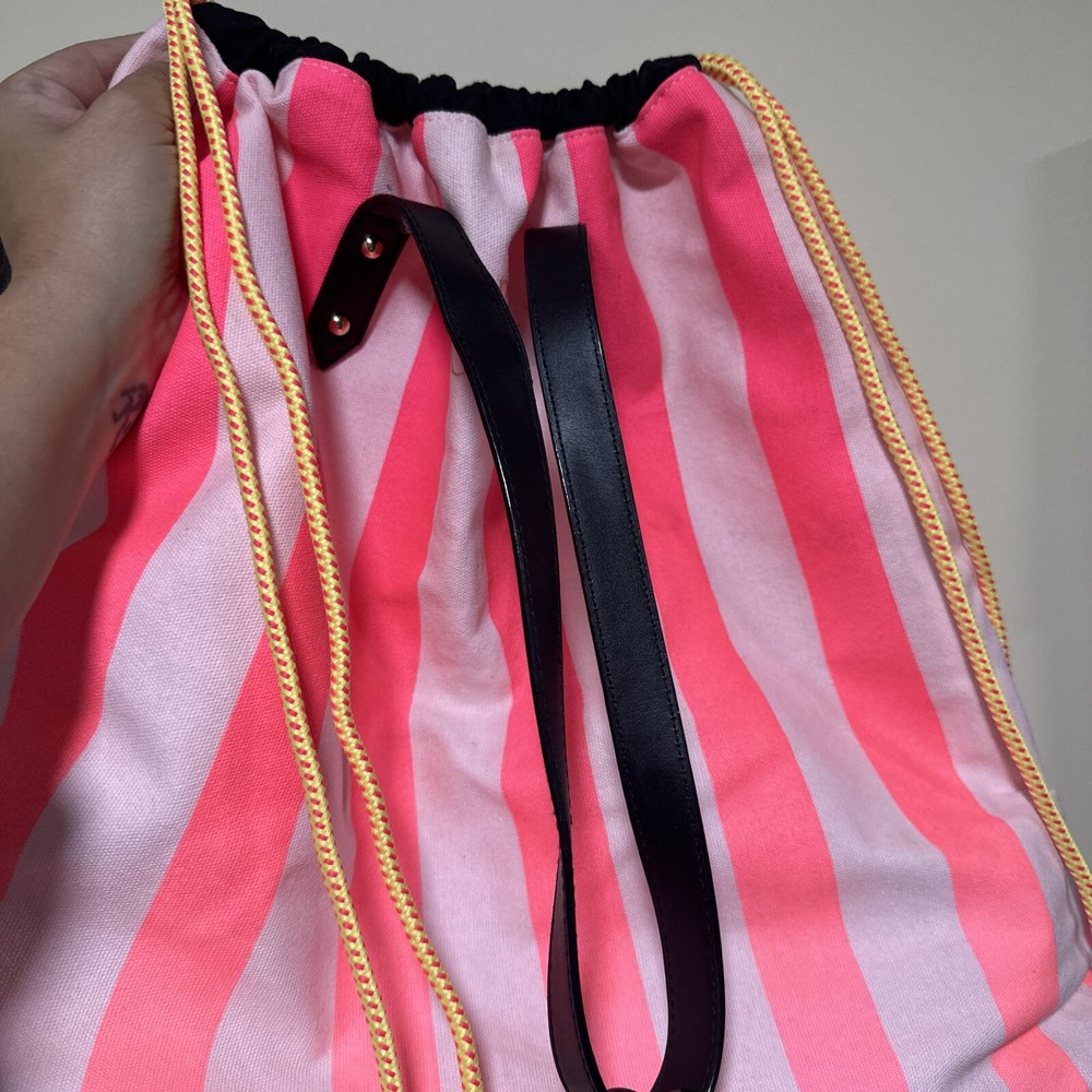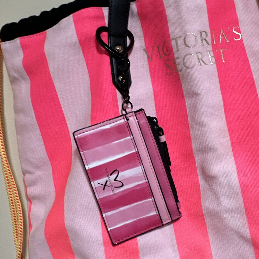 This Victoria's Secret Love Pink tote bag is perfect for your next beach getaway. With its neon pink and stripes design, it's both stylish and functional. The extra-large size and drawstring closure make it easy to carry all your essentials, while the double handles allow for hand or shoulder carrying. The bag is made of lightweight canvas material and is foldable for easy packing. It also includes a free card holder for added convenience. Whether you're traveling or just heading to the beach, this tote is a must-have accessory. Bag is never been used but been long time on display. Little tiny dirty perhaps. Wallet card holder is preused but in excellent shape.