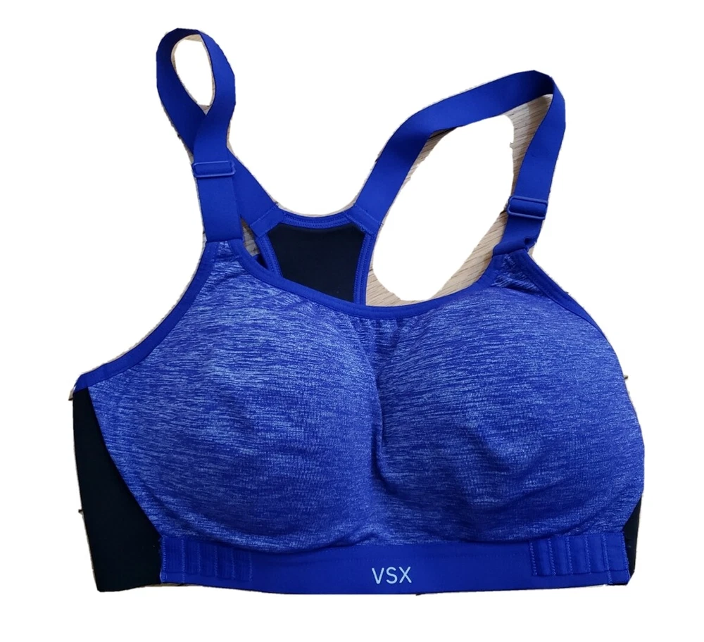 Victoria's Secret VSX Sport bra padded Good pre-owned condition, no flaws Body: 52% nylon, 38% polyester 10% elastane Wings: 70% nylon, 30% elastane, Center back: 88% polyester, 12 % elastane Sports bra slips on over head, hooks in front No underwire Marked a size 34B