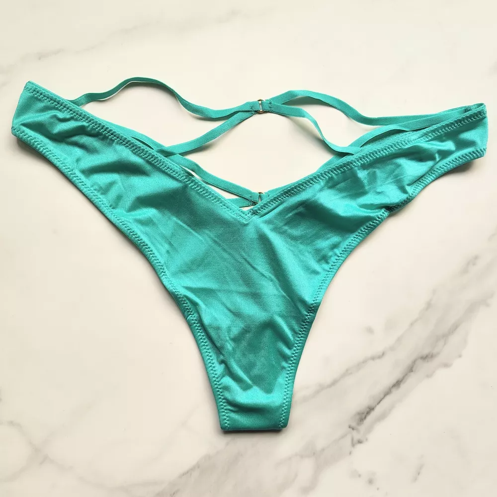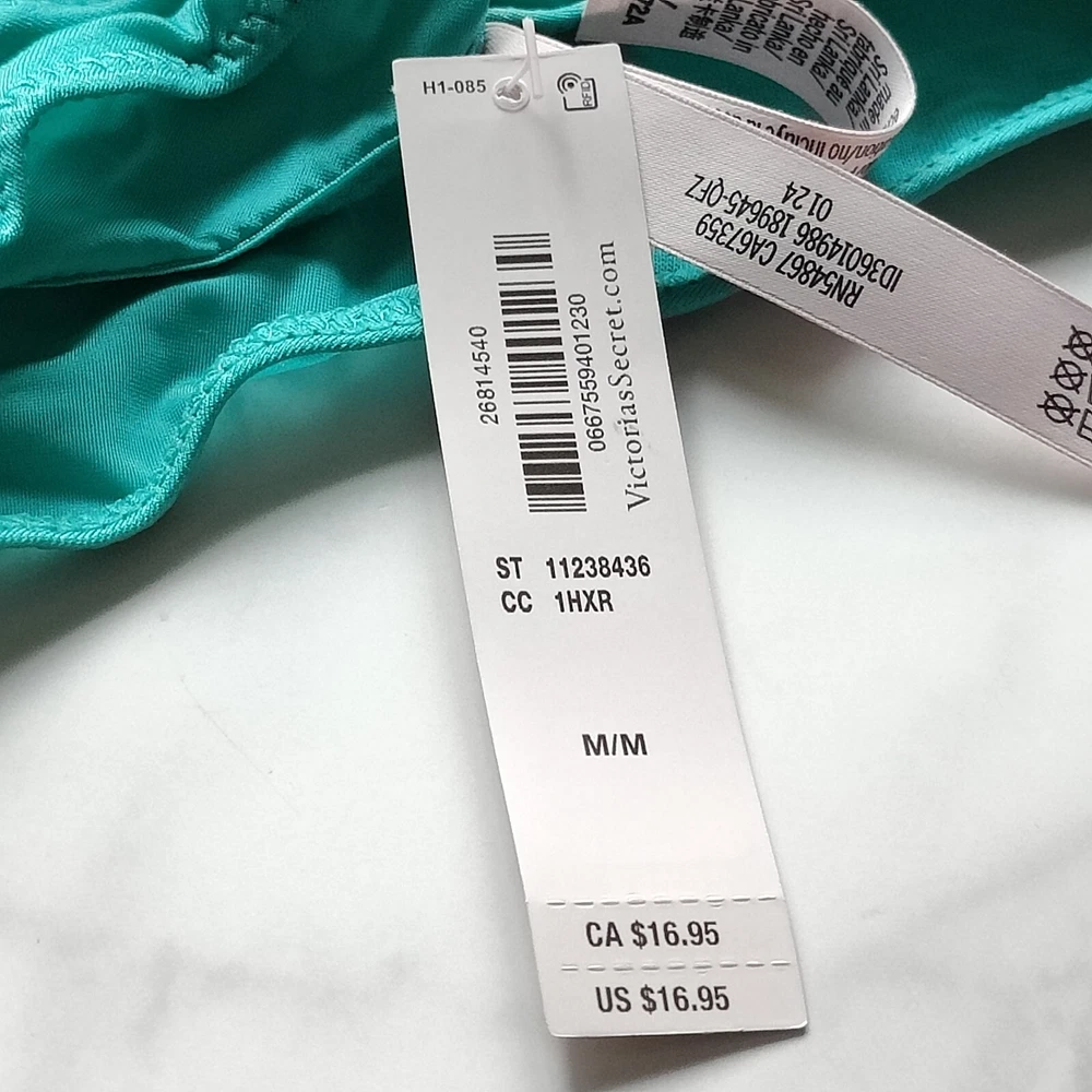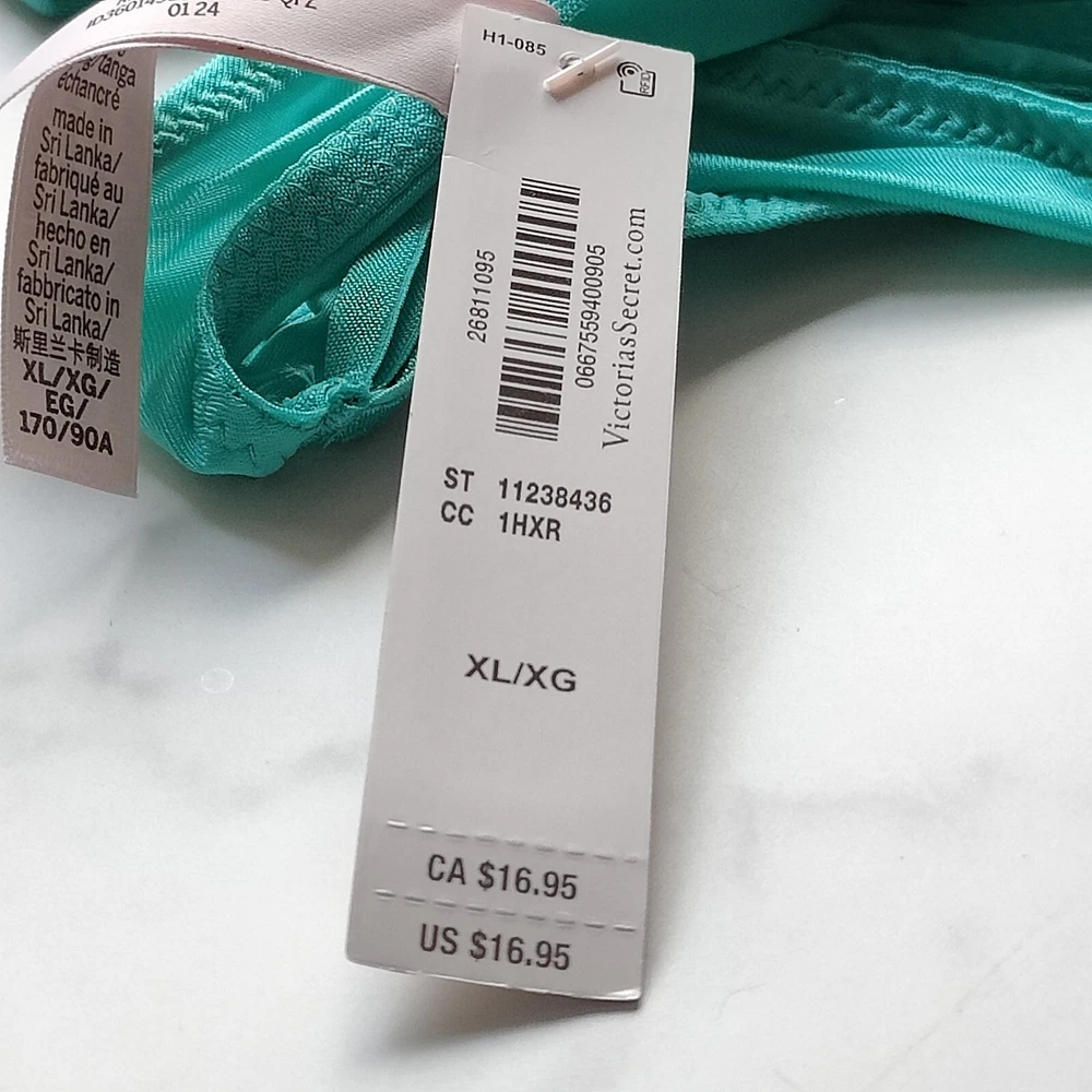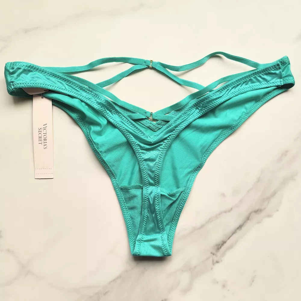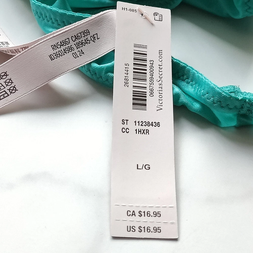 All photos are taken by Goob's Closet & Boutique and may not be reused without permission. Goob's Closet & Boutique lists on multiple platforms. If you choose to wait or "Watch", the listing may sell out on another platform first, and will then no longer be available for purchase on eBay without notice to you. With its minimal back coverage and low-rise design, this panty sits perfectly on your hips, giving you that sleek and sexy look. The high-cut leg openings elongate your legs, while the soft and stretchy microfiber fabric feels incredibly smooth against your skin. The strappy details at the back, accented with gold-tone hardware, add a touch of intrigue, making this thong not just an undergarment but a statement piece. Plus, it’s partially made from recycled materials, so it’s a choice that’s both stylish and sustainable. And the 100% cotton gusset ensures all-day comfort, making it a perfect blend of fashion and function. Details Thong Style Minimal Back Coverage Low Rise High-Cut Leg Openings Soft and Stretchy Lightweight Microfiber Fabric Elastic Waist and Leg Openings Elastic Strappy Details at Back Gold Tone Hardware Made Partially from Recycled Materials 100% Cotton Gusset Style No. 11238436 Color: Aqua Sea CC (Color Code): 1HXR Material Body: 77% Recycled Polyamide, 23% Elastane Gusset: 100% Cotton Care Machine Wash Measurements Victoria's Secret Size Small (S) will fit US Size 4-6, Waist 26-27 inches, Hips 36.5-37.5 inches best. Victoria's Secret Size Medium (M) will fit US Size 8-10, Waist 28-29 inches, Hips 38.5-39.5 inches best. Victoria's Secret Size Large (L) will fit US Size 12-14, Waist 30.5-32 inches, Hips 41-42.5 inches best. Victoria's Secret Size Extra Large (XL) will fit US Size 16-18, Waist 34-36 inches, Hips 44.5-46.5 inches best.