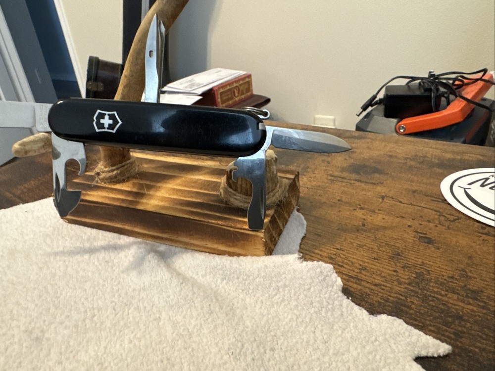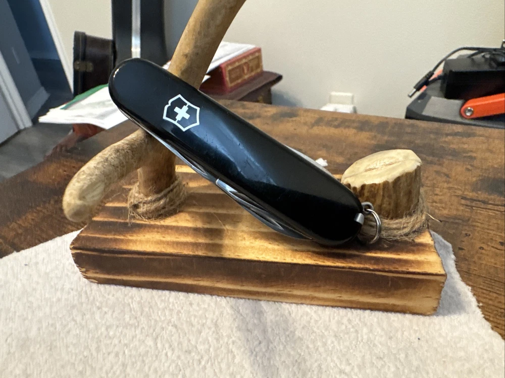 The Victorinox 91mm Tinker Swiss Army Knife Black #1 is a pocketknife that features a manual opening mechanism and a slipjoint lock type. It has two blades made of stainless steel, a drop point and clip point blade type, and a plain edge. The handle is made of plastic and the knife comes in black It also includes a punch, toothpick, screw driver, and bottle opener tools. The knife is part of the Military product line and is an original piece.