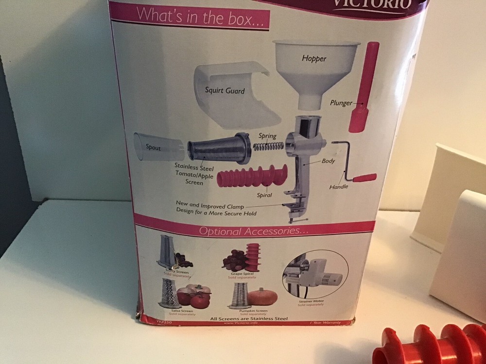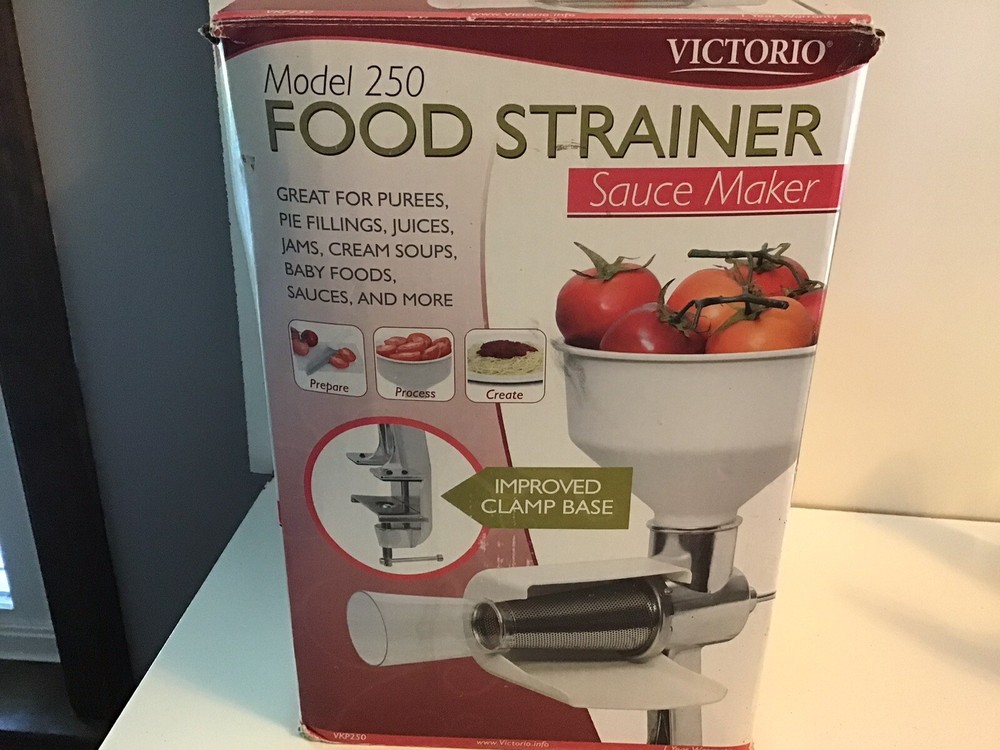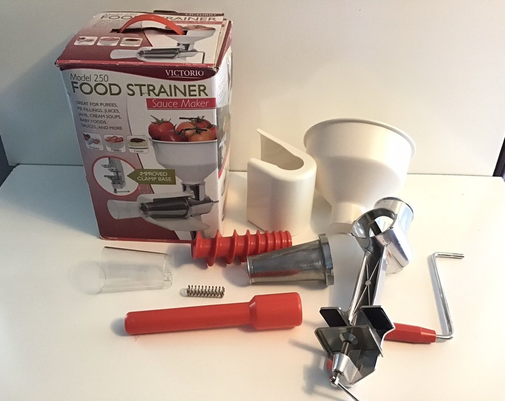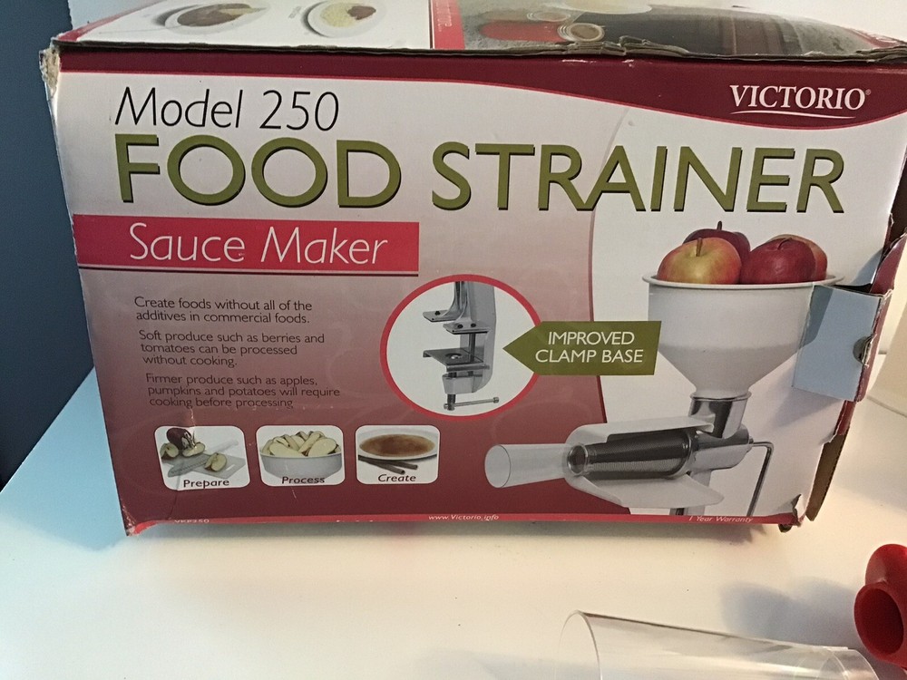 Victorio Food Strainer Sauce Maker. Model 250 VKP250. Great for apples, tomatoes or baby food Gently used. In great condition. All pieces in great condition. Comes in original box. Box has damage due to use and storage. I ship my items out the next day after payment is received.