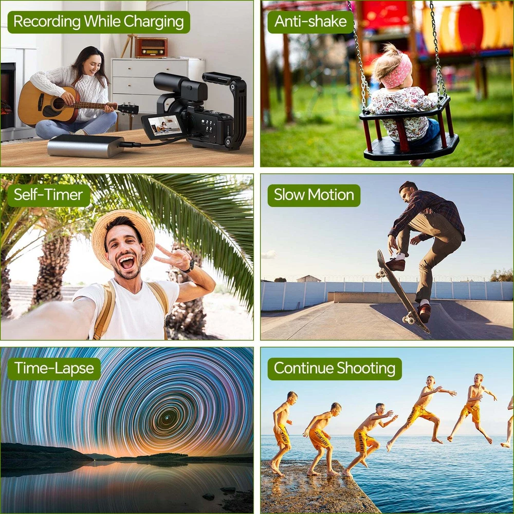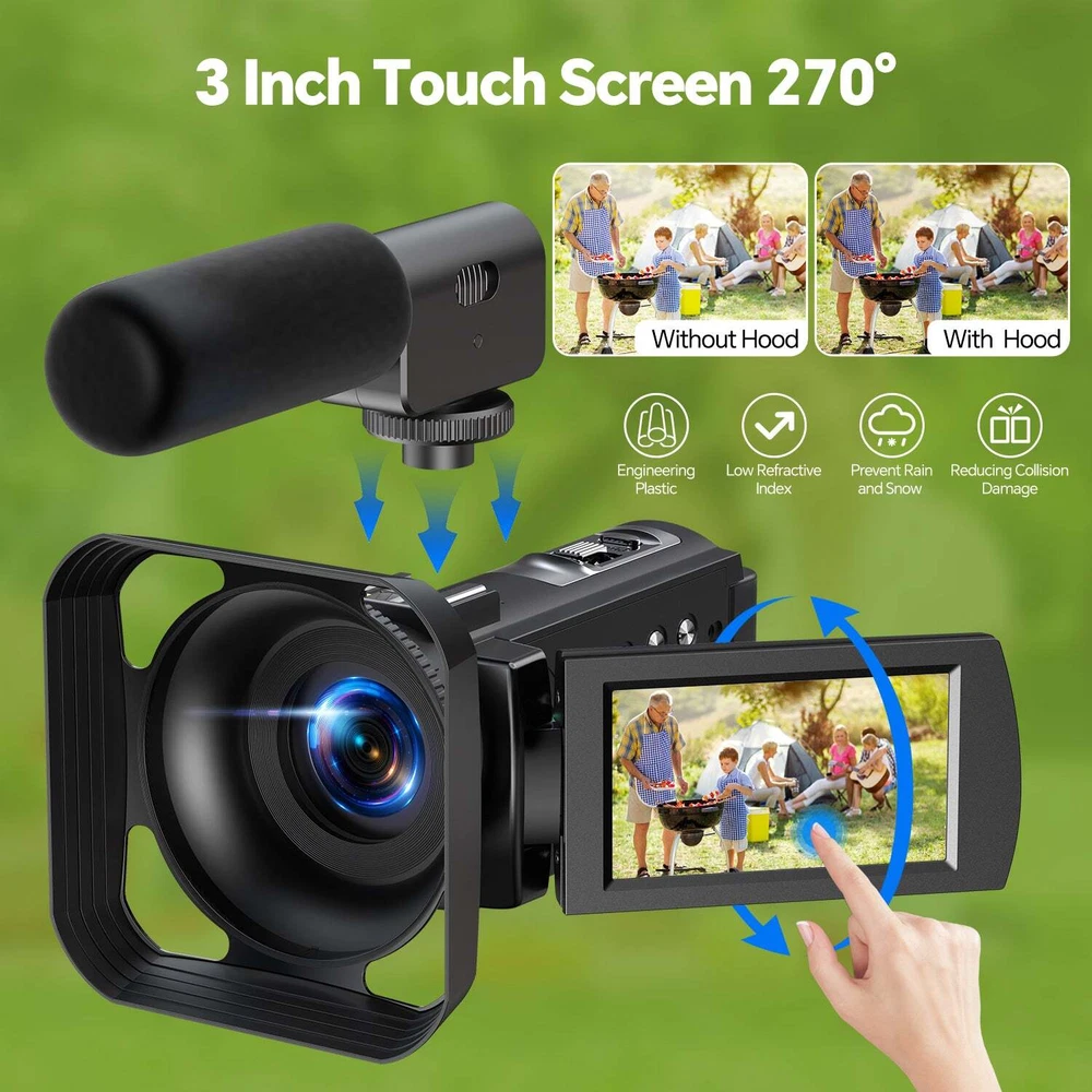 【2024 New upgrade】 US STOCK! Fast delivery, Fast received!!! CAMPARK 5K 56MP Video Camera Camcorder IR Night Vision YouTube Vlogging Podcast Camera 5K 56MP Camcorder Video Camera WiFi 3'' 270° Rotatable Touchscreen Vlogging Camera Youtube Camera Podcast Recorder Video Camera with 64GB SD Card, Remote Control, 2 Batteries, Hood, Microphone, Tripod 【5K & 56MP Video Camera with 64G Card】 The video camera delivers UHD 5K video and 56MP photos, giving you a stunning visual experience. Paired with a 3.0 inch 270°rotation touchscreen, you can shoot at any angle. The digital camera supports 16x digital zoom, making it easy to capture distant scenery. Comes with a 64G SD card to plug and play.This handycam is an ideal camera for meeting,wedding, parties, travel. 【IR Night Vision & WiFi Function】 The vlogging camera with IR night vision technology that can helps illuminate dark environments,take clear white/black photos or videos in the dark.The vlog camcorder supports WiFi function and comes with two large-capacity rechargeable batteries, which can recording while charging, extending the shooting time, suitable for beginners, teenagers, youtubers. 【Webcam Function & 2.4G Remote Control】 This 5K YouTube camera can be used as a webcam or a live streaming camera.You can also use the included HDMI cable Connect this vlog camera to your TV to share pictures and videos with family and friends,equipped with a 2.4G remote control, which can control the camera from multiple angles, allowing you to place it on the included tripod for control. 【Handheld Stabilizer & Lens Hood】 This 5K video recorder comes with a foldable handheld stabilization stand to keep the camera stable while recording, easily record sports moments. Lens hook blocks excess light for clear footage and protects your camera lens from accidental damage. External microphone can reduce noise, improve audio and video quality, make video sound clear and stable. 【Multi-Function & After-sales service】 The blogging camera support pause function, anti-shake, Selfie, time-lapse shooting, slow motion, loop recording, recording while charging, webcam, HDMI output, which will meet your different needs. Supports external tripods and LED fill lights. If you encounter any problems, please contact us in time. We will support 1-year After-sales service. Package include: 1×Video Camera Camcorder 1×USB Cable, 1×HDMI Cable,2×Batteries 1×Camcorder Bag, 1×Handheld Stabilizer 1×Microphone, 1×Tripod, 1×Remote Control 1×User Manual 1x64GB SD Card Warm Tips: 1.The 5K camera video Supports U3 speed 64 GB SDHC Card(included). 2.Do not insert or remove the memory card during as this will damage the memory card lose date. 3.Before using the remote control, please remove the battery protection sheet of the remote control. PIease aim the remote control at the remote control receiver, and do not block it. 4.If choose "PC camera", you need to do download the corresponding software. 5.Once EIS is turned on, 5K/25fps resolution cannot be chosen. Once EIS is turned on, the "W/T" zoom function cannot used. 6.Once loop recording is turned on, new videos will overwrite old videos. Please save important files in time. 7.Loop Reording, Slow Motion and Time-lapse Record cannot work at the same time. After turning on the special recording mode, you need to press"REC" to make the camera work in the specified mode. 8.When Slow Motion or Time-lapse is enabled, the Reord Audio is turned off by default and this setting does not work. 9.The camera WiFi can only be connected to a mobile and cannot access the internet. 10.The digital video camera with night vision has a 16x digital zoom function, but it does not support the focus function. You should therefore keep the recording distance more than 0.6 m. 11.The 5K camcorders is design for the amateurs,not for the Professional users.(Auto focus is not supported, optical zoom is not supported) Webcam Function & HDMI Output The 5K vlogging camera for Youtbe can be used as a webcam to conduct video and audio conversations and communications on the network through the podcast camera. You can also connect the vlog camera to the TV with an HDMI cable, and you can playback videos or photos with your family or friends. 5K 25FPS & 56MP &16X Digital Zoom Video Resolution: MP4, 5K 25fps; 4K 30fps; 2.7K30fps; 1080p60fps; 1080p30fps; 720p60fps; 720p30fps Photo Resolution :JPG, 5M; 8M; 12M; 16M; 20M; 24M; 36M; 48M; 56M The Youtube camera support 4x,8x,16x digital zoom 3 Inch 270° Rotation IPS Touch Screen The video camera camcorder 5K has a 3.0” LCD 270° rotatable Touch Screen which you can swivel for selfies and see exactly what you're filming. Handheld Stabilizer The foldable handheld stabilizer saves space and easy to install.Suits for recording moving objects, reducing filming camera shake and shooting clearer pictures and videos. Video Camera with Microphone There is a hot shoe mount on the top of video camera for filming, and an external microphone is installed to eliminate surrounding noise during use, and the sound quality is clearer. WiFi Connection Downloading "Lercenker" APP, easy to connect the camcorders night vision with Android/iOS smartphones and tablets. 5K WiFi camcorder enable remote view, image capture and video shooting. Adjustable Camera Tripod The digital camcorder tripod can be rotated 360° to keep the 5K camcorder video camera for youtube stable at different shooting angles.