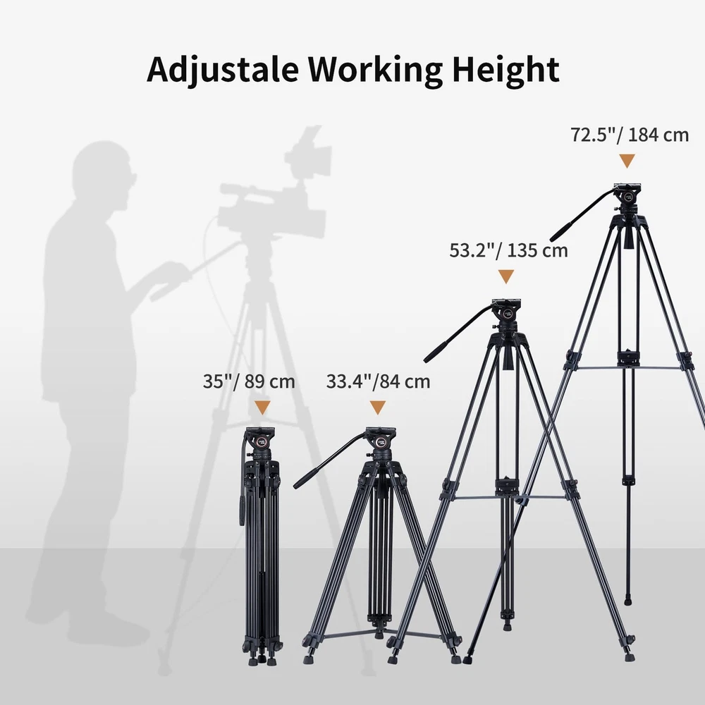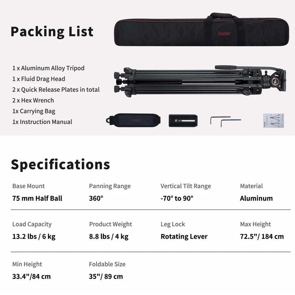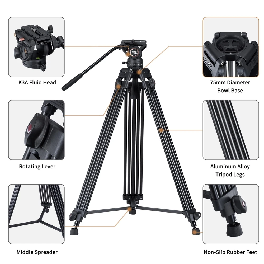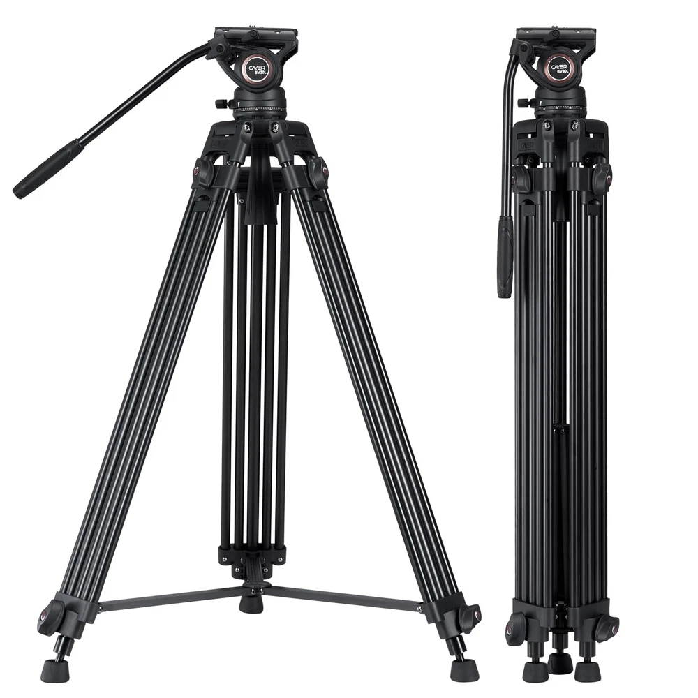 The BV30L Professional Tripod System includes the BV30L Aluminum Tripod and K3a Fluid Head with Carrying Bag. Capable of supporting up to 13.2 lb, the BV30L provides a professional tripod system solution. K3a Video Head - Weighs 2.5 pounds, supporting up to 13.2 lb - Separate pan and tilt lock levers, a built-in bubble level indicator - Fixed counter balance, pan, and tilt drag, +90°/-70° tilt angle, 360° panning - One interchangeable Pan Bar for right and left-handed operators via the two rosettes on either side of the head - Two universal quick release plates, with ¡À20mm sliding range, a 1/4"-20 Screw and a Spare 3/8"-16 Screw - Tightened with a 75mm half-ball mount, integrated flat base with 3/8"-16 thread in the center, able to be secured to flat-mount accessories such as sliders, jibs, and more without unwieldy bowl adapters BV30L Tripod Leg - Built-in 75mm bowl - 2-stage 3-section leg design allows you to adjust the height of the tripod from 35" to 72.7" - Mid-level spreader provides enhanced stability by holding the tripod legs in locked position - Supports payloads of up to 88lb, even larger video heads or heavy dollies and sliders can be supported by the tripod itself Specificaions: Material: Aluminum Alloy Tilt range: -70° to +90° Pan range: 360° QR Plate Length: 4.33" / 110 mm Friction Control: Fixed Mounting Platform: 1/4" ; spare 3/8" screws Diameter (bowl):3" / 75mm Sections: 3 Flod Length: 35" / 890 mm Max. Operating Height: 72.7" / 1845 mm Min. Operating Height: 33.3" / 848 mm Loading Capacity: 13.2 lbs / 6 kg Weight: 8.82 lbs / 4 kg Packing List: 1 x BV30L Tripod Leg 1 x K3 Fluid Head 1 x 75mm Half Ball Adapter 1 x Head Lock Handle 1 x Extra QR Plate (2 pcs in total) 2 x Hex Keys 1 x Carrying Bag 【Video Tripod System】This video tripod includes the two-stage heavy duty aluminum tirpod legs and fluid head, with a 75mm bowl base offering 13.2 lb playload, perfect for both camcorders and DSLR cameras 【Pro Fluid Head】Featuring a 75 mm ball video head with fluid drag system, it offers 360° pan rotation and -70° to 90° vertical movements smoothly. This fluid head also features a side lock system for the sliding quick release plate, a pan handle, and an integrated bubble level 【Stable & Adjustable Tripod】The heavy duty tripod legs are made from aluminum and feature a middle spreader provide enhanced stability to the entire system. The head and tripod legs combination features a height range of 33.4" to 72.5" and folds to 35" long for transport and storage in the included carrying case simply 【Wide Compatibility】This video tripod kit includes two quick release plates, each plate comes with both 3/8"-16 and 1/4 "-20 screws compatible with various cameras, camcorders and more; the fluid head features a 3/8"-16 female threaded hole on the bottom for attaching to tripods, sliders, and other platforms 【Packing & Data】1 x BV30L Heavy Duty Tripod with Fluid Head , 1 x Carrying Bag , 2 x QR plates , 13.2 lb Loading Capacity , 33.4" to 72.5" Height Range , Tilt Angle +90° / -70° , 360° Panning , 75 mm Base Ball Diameter
