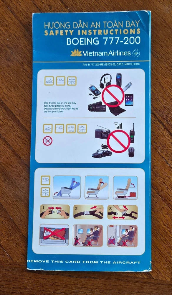 This is a rare, lightly used, tri-fold safety card for the Vietnam Airlines B-777-200 which is dated back to March 2016.. It is in very good condition with no stains, no tears, nothing sticky and no writing on it BUT there are a couple of minor creases on the top right of the cars and some minor wear at the bottom of the card.... Pictured is the aircraft that it came from..