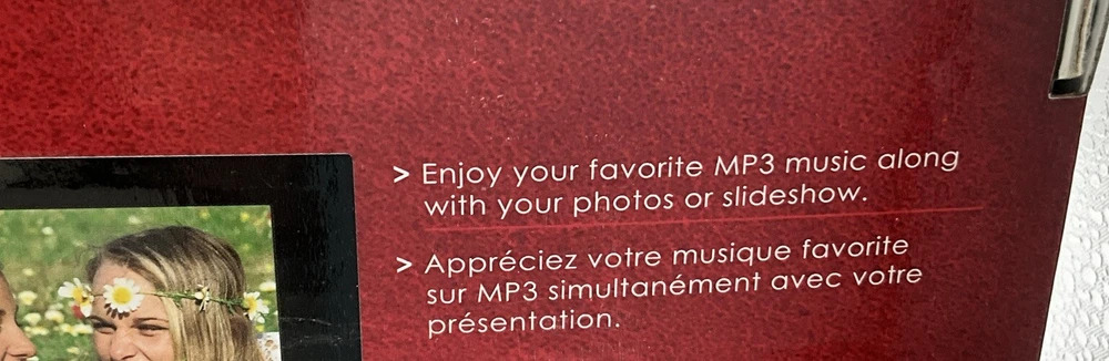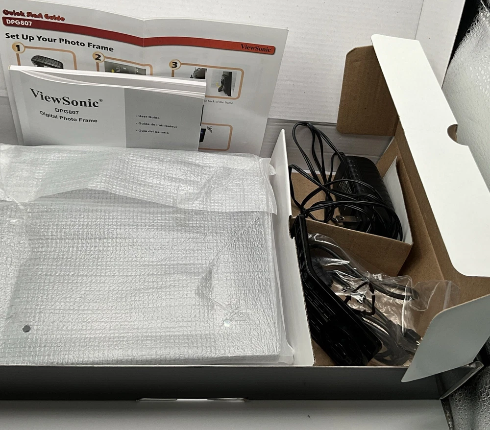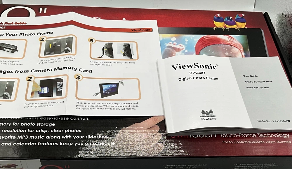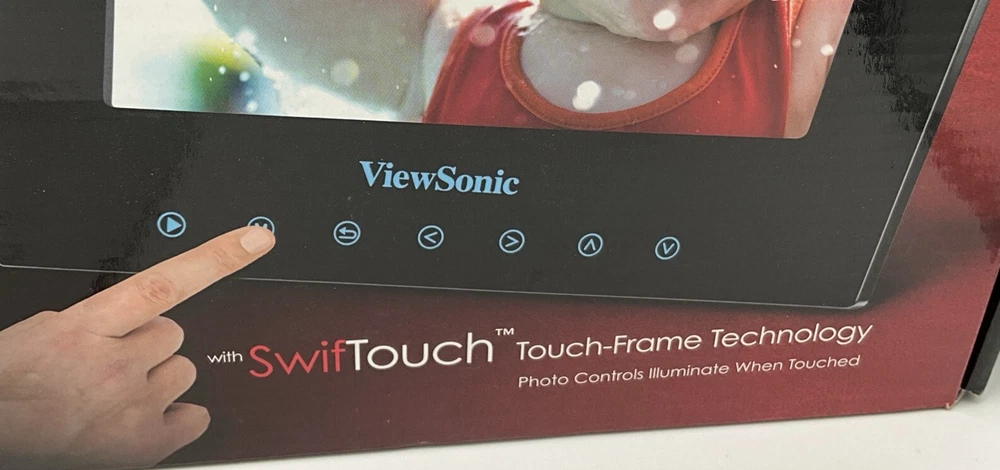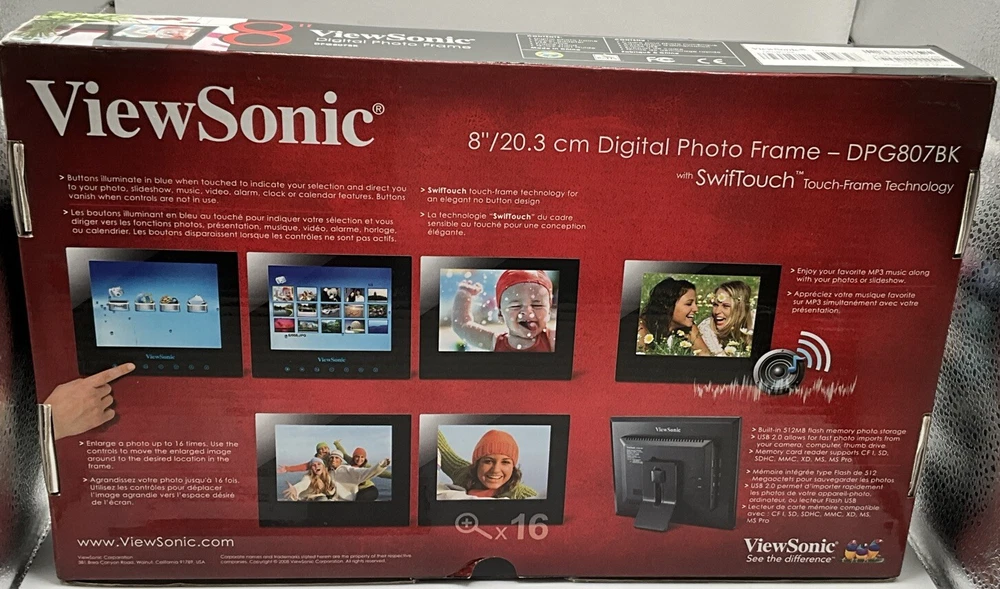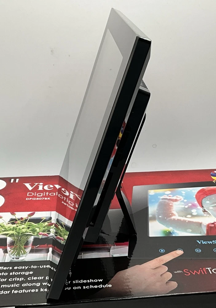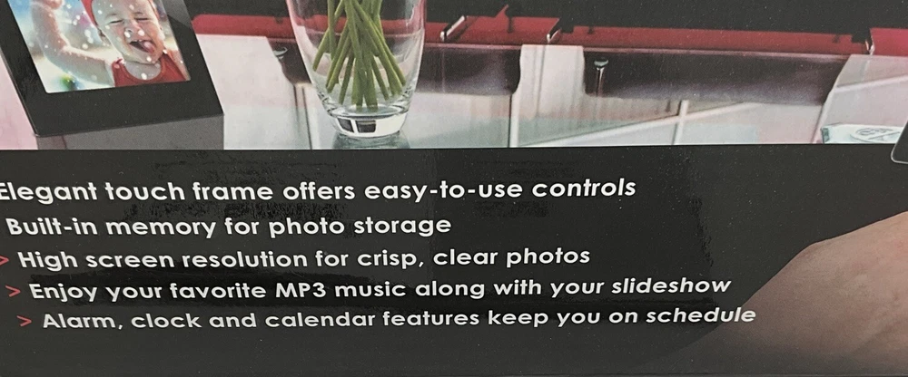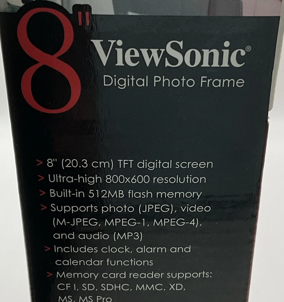 This is a used item that works perfectly. Original packaging and all paperwork. The previous owners took great care of this photo frame. This is an 8” digital photo frame with slideshow and music capability. Alarm clock and Calendar Elegant touch frame offers easy to use controls Seven touch buttons in frame front panel Built in memory for photo storage High screen resolution for crips, clear photos Enjoy your favorite MP3 music along with your slideshow Supports earphone connection Automatic slide show with multiple transition effects and desired interval setting JPEG, MPEG-1 MPEG-4 M-JPEG Compatible with SD/MMC/MS/XD and CF memory cards uSB host for connecting to USB mass storage uSB 2.0 transmission speed for download Returns are accepted with buyer to pay return shipping.