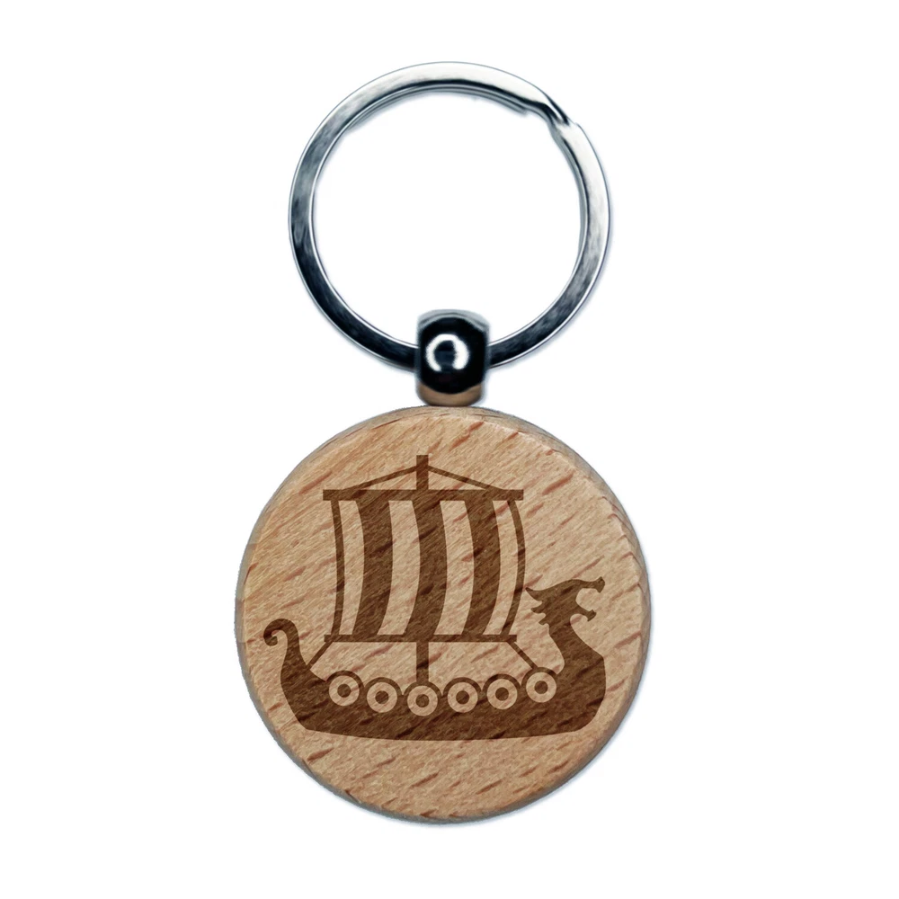 Viking Dragon Longship with Striped Sail Engraved Wood Round Keychain Tag Charm