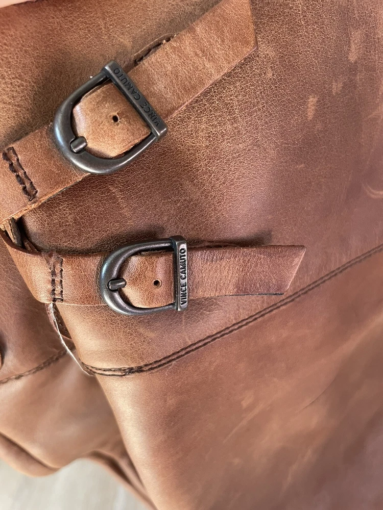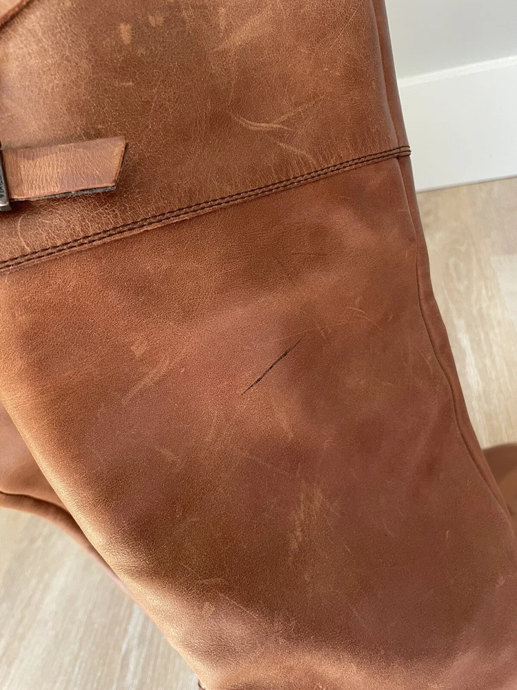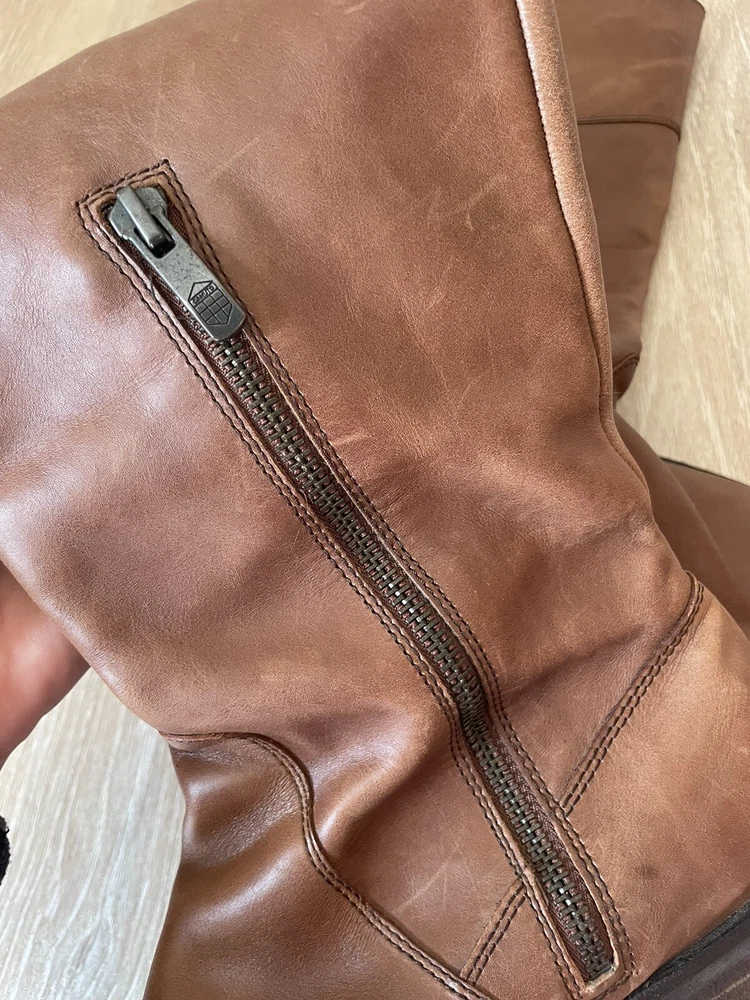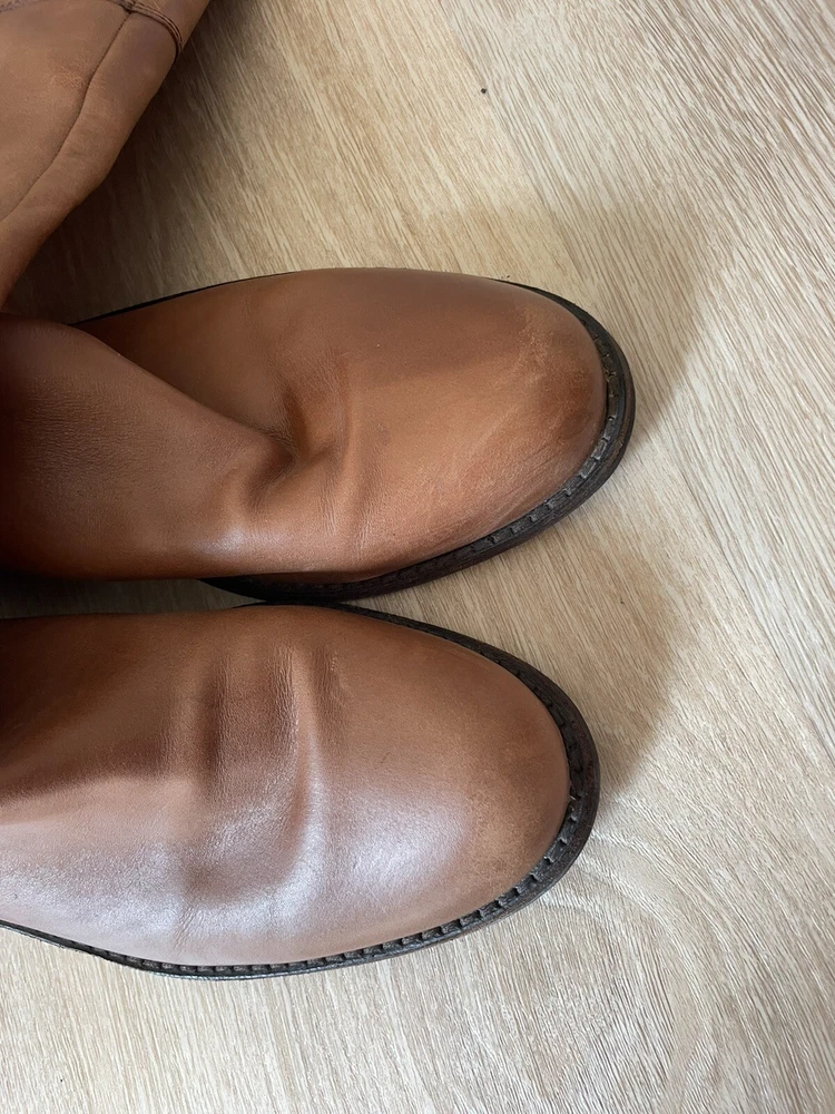 Vince Camuto Keaton Brown Leather Riding boots. Size 9.5. Great equestrian style riding boots for cooler weather. Good condition with some natural wear marks to the leather that you’d expect from preowned. One spot in photos that appears to be a black line mark. One nick on the outer heel in photos. One bottom (see pictures) has a whitish cast? I’m not sure what it is but it’s not seen when wearing. Please see the pictures so there are no surprises. Zippers on the inner ankles to make them easier to side your foot in. Overall a nice pair of boots, some mentioned imperfections, but great quality.