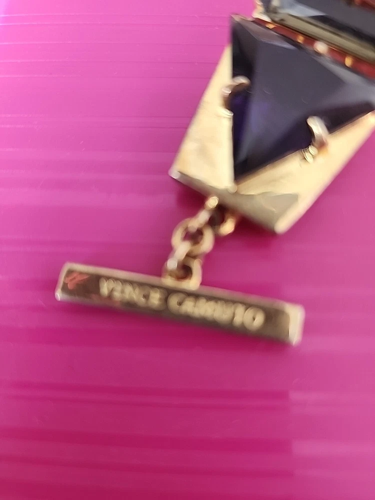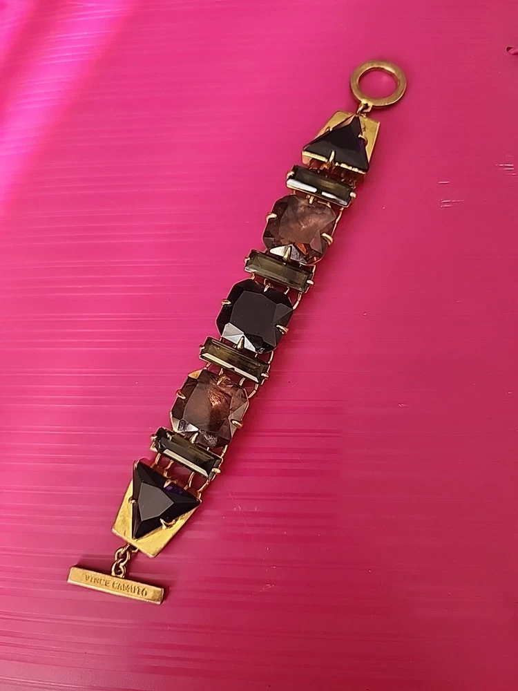 AElevate your accessory game with the Vince Camuto Hinge Cuff Bracelet. Featuring an elegant open hinge design, this cuff is a harmonious blend of sophistication and modernity. The bracelet is beautifully plated in yellow gold, offering a luxurious touch to your outfit. It's adorned with crystals that catch the light, adding a subtle sparkle to your every movement. Crafted with a combination of crystal and resin materials, the cuff exudes a chic appeal while ensuring durability. The gold color of the main stones complements the metallic sheen of the plating, making it a versatile piece that pairs effortlessly with both casual and formal wear. Enjoy the timeless style of Vince Camuto with this exquisite addition to your jewelry collection.