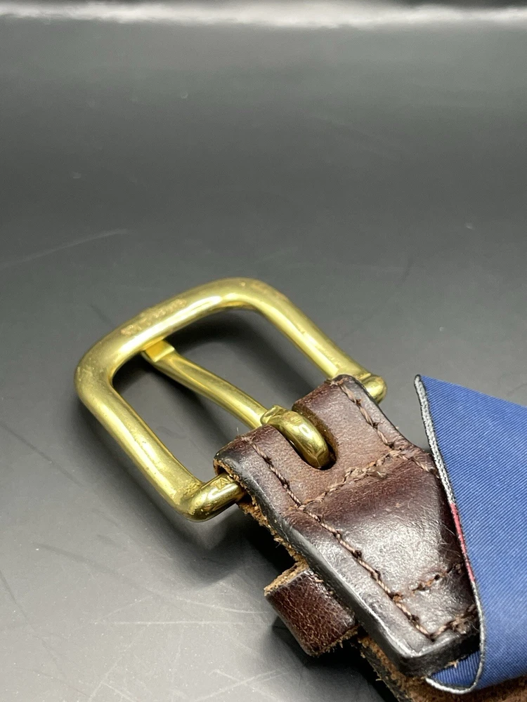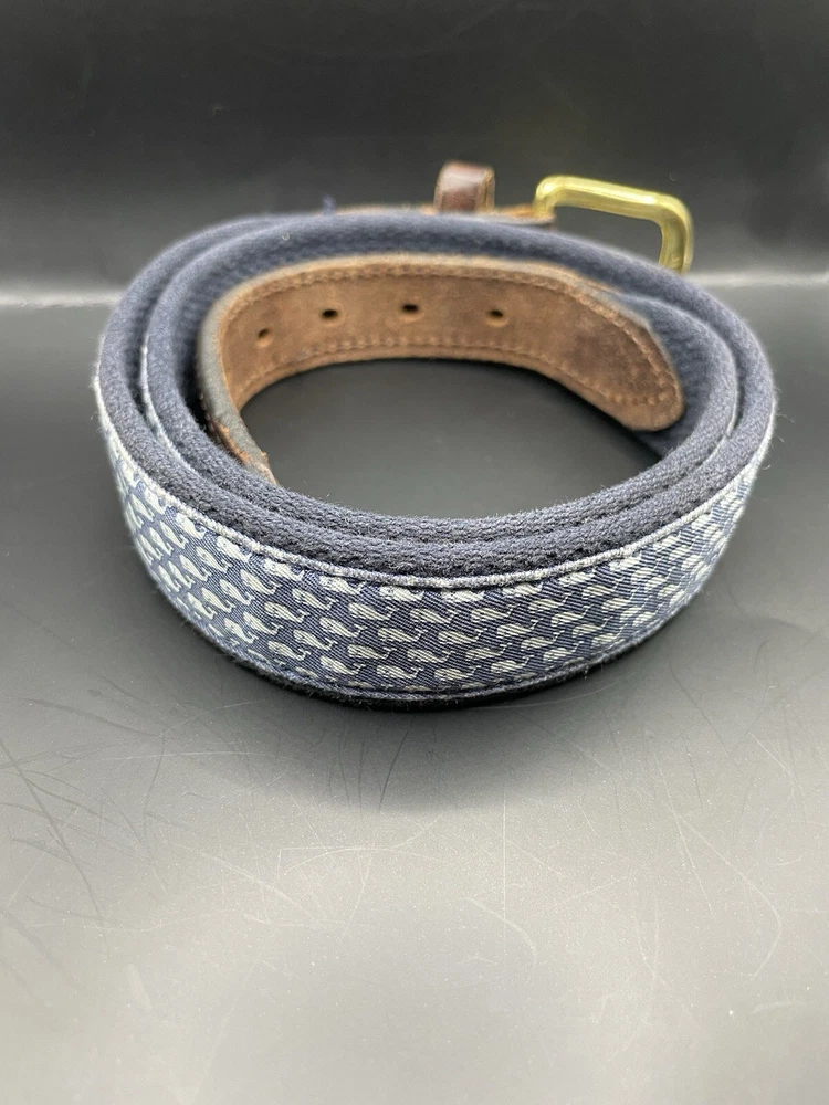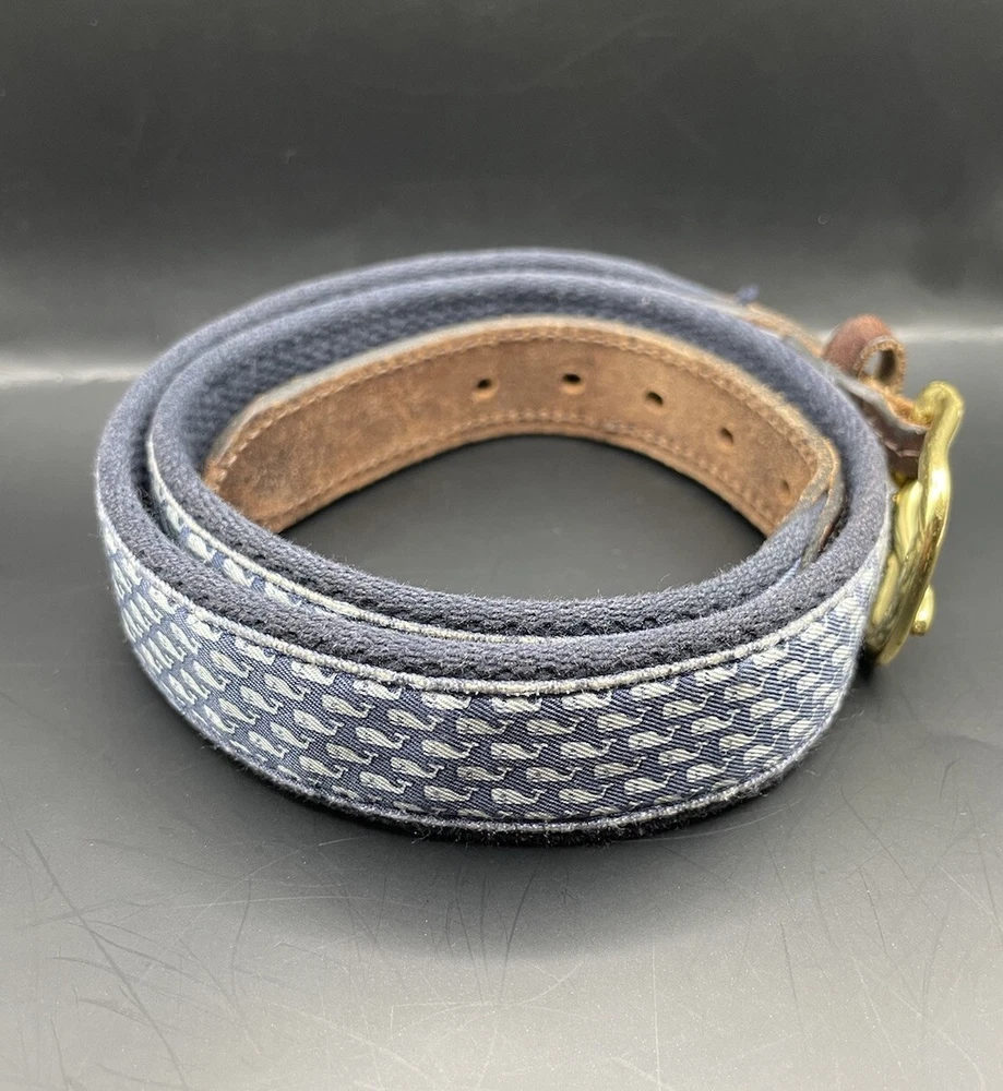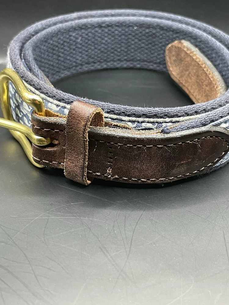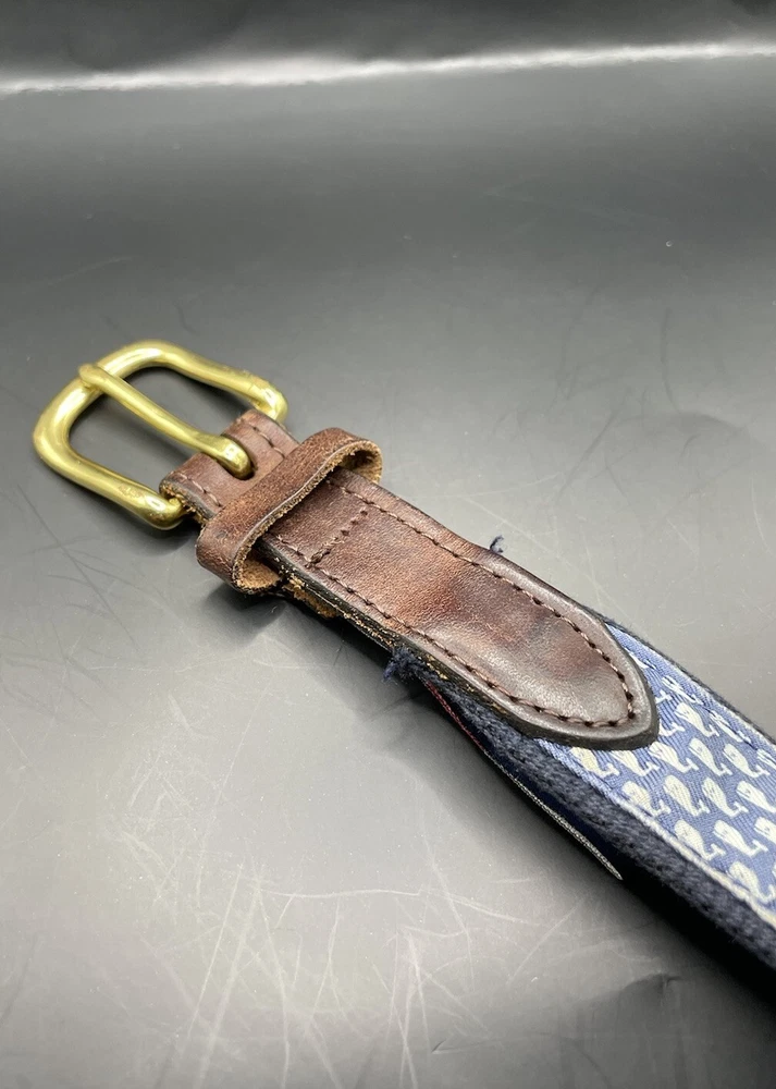 Elevate your style with this Vineyard Vines belt featuring a playful whale pattern. Made in the USA with high-quality materials including polyester, brass, leather, and cotton, this belt is perfect for any occasion. The multicolor design and classic style make it a great addition to any wardrobe. This men's belt has a 30-inch size and features a buckle closure with a braided/woven design. The logo accents and animal print pattern add a touch of fun to this classic piece. Whether you're hitting the golf course or adding some color to your everyday outfit, this Vineyard Vines belt is the perfect choice. Some wear overall good condition.