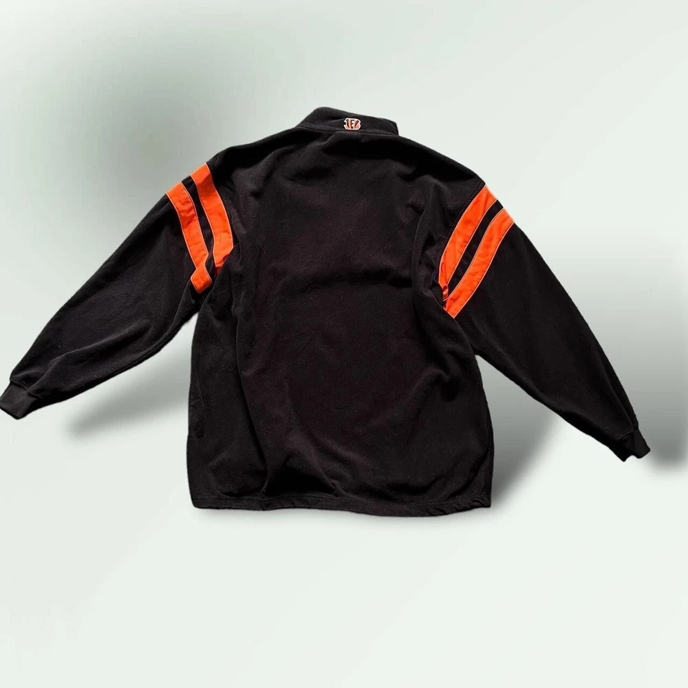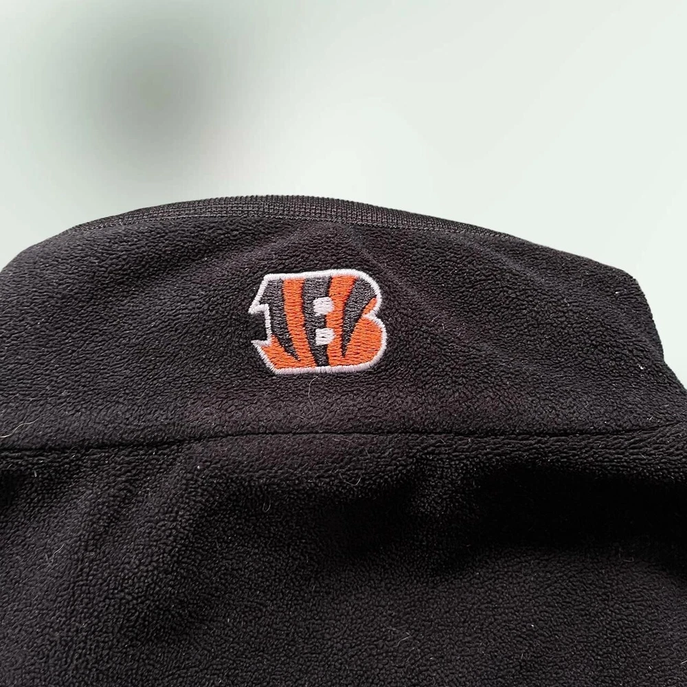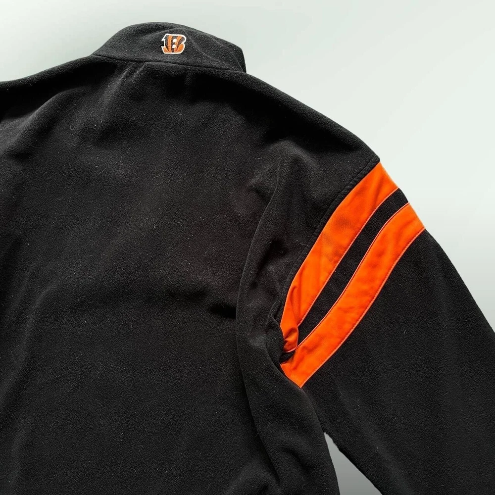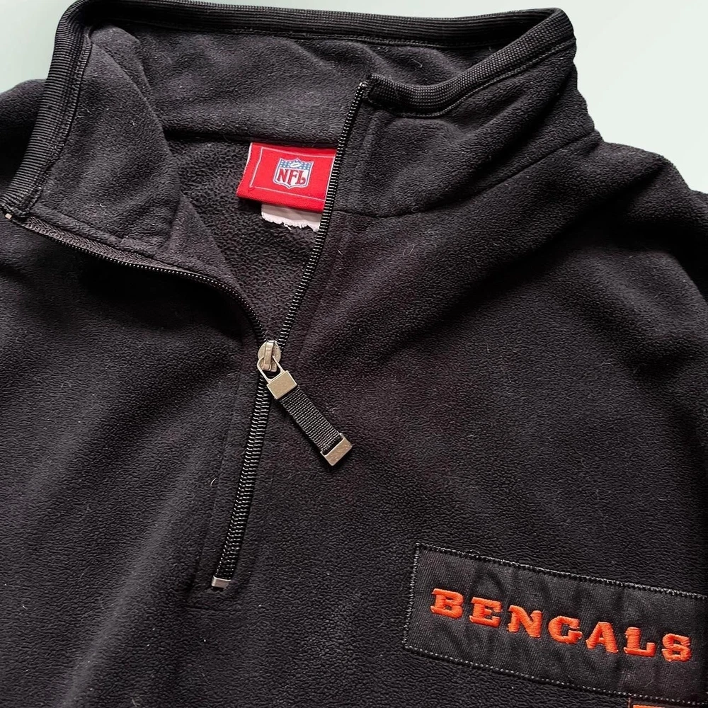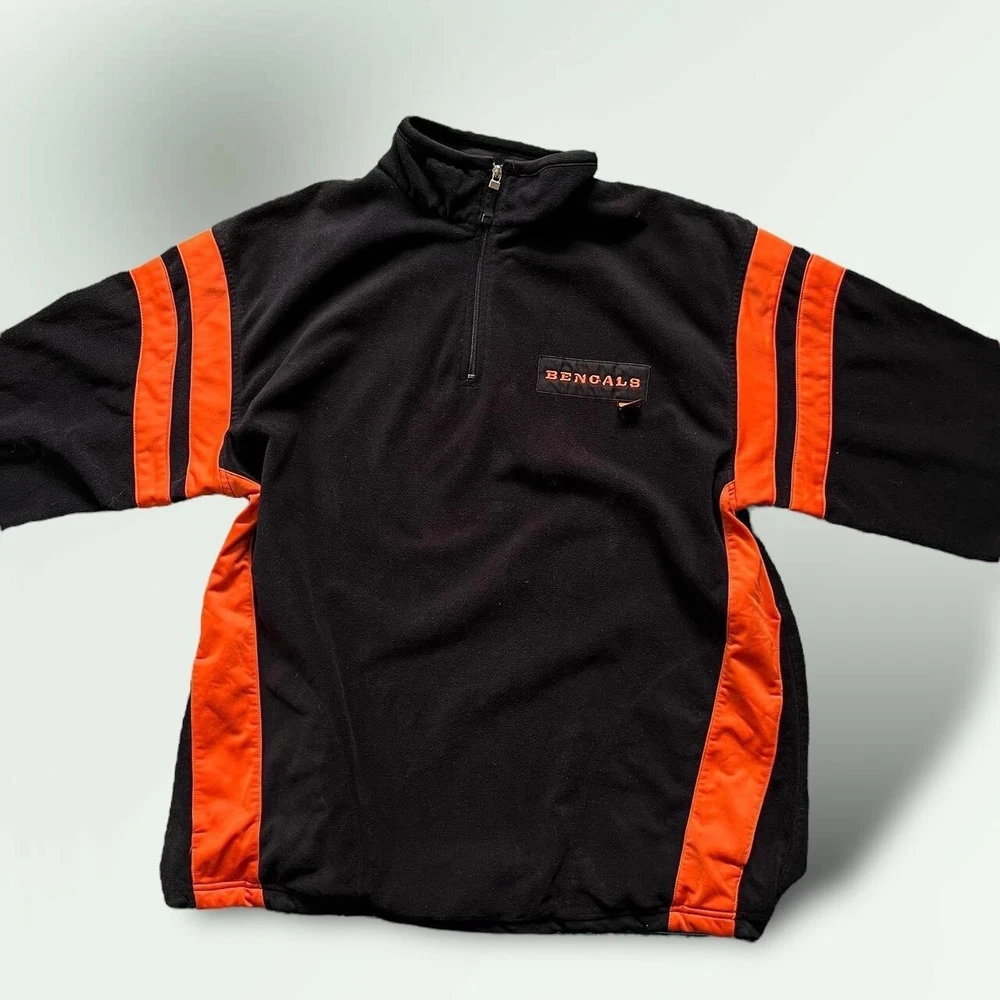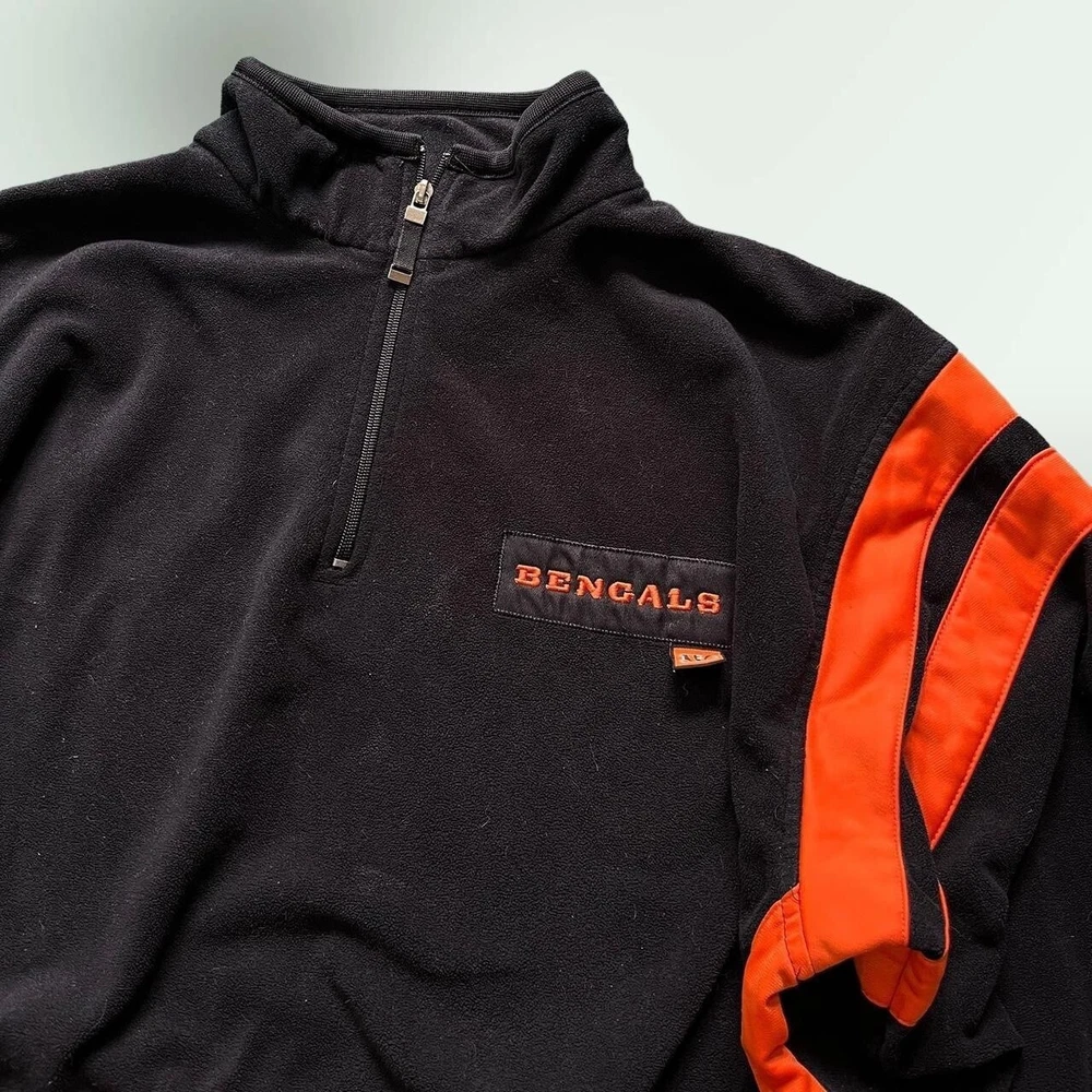 Vintage Y2K Cincinatti Bengals NFL 1/4 zip fleece jacket | boxy relaxed fit | black x orange π‘ excellent condition- no faults π‘ embroidered logos- Bengals patch on chest, NFL logo on sleeve, B symbol on the back of the collar π‘ drawstring adjustable waist, two pockets π‘ 100% polyester fleece fabric π size XL - could also fit baggy L - p2p 26" l30"
