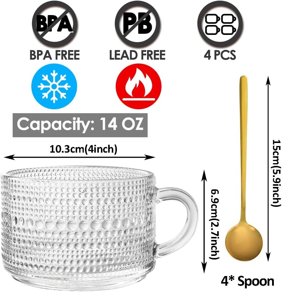 CLASSIC VINTAGE DESIGN: glass coffe cup decorated by embossed and comes with a sunflower pattern that makes the cup look more simple and elegant. It can add a touch of sophistication to your favorite drink and look unique in any occasion. The mug has a curved handle for a comfortable grip and can be used safely in everyday life. PERFECT LARGE CAPACITY MUG: Glass coffee mugs measures 2.7'H*4'W inch. The large capacity of 14 ounces can be used for iced coffee, latte, espresso, yogurt, milk, juice and any hot or cold drinks. With a 4-inch cup spout and 5.9-inch gold spoon for easy mixing and stirring, you can easily enjoy all your favorite beverages. HIGH QUALITY GLASS: Stackble coffee mugs made of thick and heavy glass, LEAD-FREE, NON-TOXIC and BPA free, which is more scratch resistant than ordinary glass and can withstand thermal shock. The cylindrical shape of the glass mugs is easy to clean and dishwasher safe. GLASSES MULTI-PURPOSE: The translucency of the glass mugs also adds to the ornamental quality, allowing the color of the drink to be fully revealed. Elegant retro coffee mug for casual or traditional venues, glass coffee mugs is the best choice for table whether for daily use, or for weddings, parties, potlucks. UNIQUE & MEMORABLE GIFT:exquisite gift packaging is perfect for engagement, wedding, anniversary, Valentine's Day and other important holidays, which can make the recipient feel your full love. We are committed to customers' good shopping experience. If you have any questions, please feel free to contact us, We will provide you with a satisfactory solution as soon as possible, thank you!