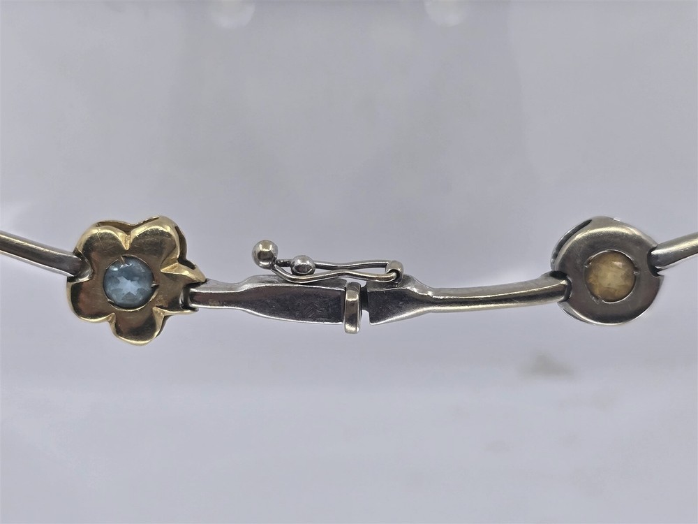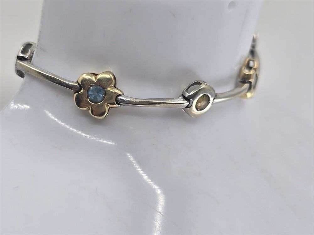 This 14k multitone gold citrine and blue topaz bracelet measures 7.25" in wearable length and 9.8 mm wide. The female end of the box clasp is stamped 14K and has a figure 8 safety latch. This bracelet has been tested as 14K. Weight 9.9 G. HT12184 Item As Is. All stones not identified unless clarified above. All items are pre-owned and pre-loved. Stones may show minor nicks and abrasions or small signs of wear. Diamonds are graded using GIA standards by GIA Graduates. Diamond and gemstone weight is estimated by formula. The metal is stamped or identified by acid testing and/or XRF alloy analyzer gun. All items shipped USPS First Class, Signature Required Items over $1000 ship overnight, Signature Required Please message with any questions. We are available Monday through Saturday 10am to 6pm. Powered by SixBit's eCommerce Solution
