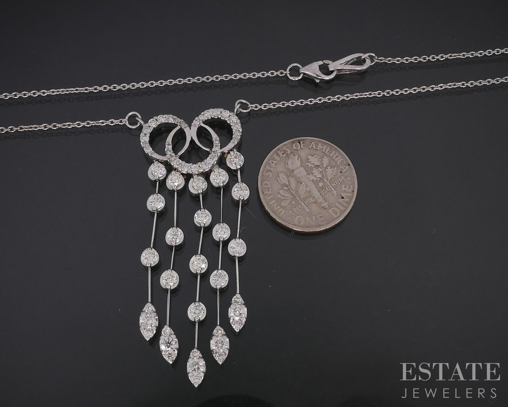 Vintage 14k White Gold Natural 1.40ctw Diamond Drop Necklace 7.7g 15"L i18958 Material : 14k Solid Gold Weight : 7.7 grams Diamond Information : Approximately 1.40ctw of round cut Diamonds. VS-SI clarity and HI color. Dimensions : 15"L cable chain and 1-3/4"L dangle pendant Condition : Like new. Cleaned and polished. Additional Info : This exquisite vintage diamond necklace, crafted in lustrous white gold, radiates timeless elegance and sophistication. The delicate chain gracefully supports a stunning arrangement of sparkling diamonds on the linked circles and dangling strands. This mid-century necklace is the perfect accessory for adding a touch of luxury and heritage to any occasion. Shipping & Handling Policy Domestic shipping is free, with paid expedited shipping services available in the shipping options. Exceptions may exist for large items. Once your item is paid for, it will typically ship on the next business day. Sorry, we can not hold items once they are paid for, per eBay policy. U.S.A. Shipments Orders are shipped USPS Ground Advantage with tracking. Your package is fully insured for all U.S.A. shipments. International Shipments International shipments are handled through eBay's Global Shipping Program and are subject to their policies, prices and shipping times. Please note that eBay does not allow combined shipping on international orders through their Global Shipping Program. Return Policy We accept returns for any reason through the eBay returns service up to 14 days after receiving the item. Items must be returned in original condition they were sold in to qualify for a full refund. Refunds can take 1-3 business days to process. Appraisals All items are inspected and graded by our GIA Graduate Gemologist. Insurance appraisals are available upon request and may be subject to additional fees. Pleast contact us if you are interested in this service. Ring Resizing Please message us prior to payment for an estimate if you would like a ring resized so that we may send an updated invoice. Ring resizing is available (up or down two sizes) on most of our gold rings, for an additional charge. Also note, returns are still accepted after the ring has been sized in most cases, but the sizing fee is non-refundable. About Us We are open Monday - Friday 10-6, EST. With more than 30 years of experience in buying and selling estate, vintage and antique jewelry, you can feel confident that every piece of jewelry you buy from us will be of the highest quality. We have a full service brick-and-mortar store staffed with highly trained jeweler, and each piece is expertly examined prior to being listed. Our inventory is always changing, there is something new to find in our eBay shop every day. You can bid with confidence knowing that you are purchasing remarkable pieces at a remarkable price!