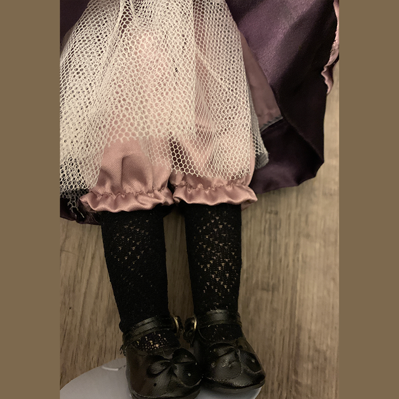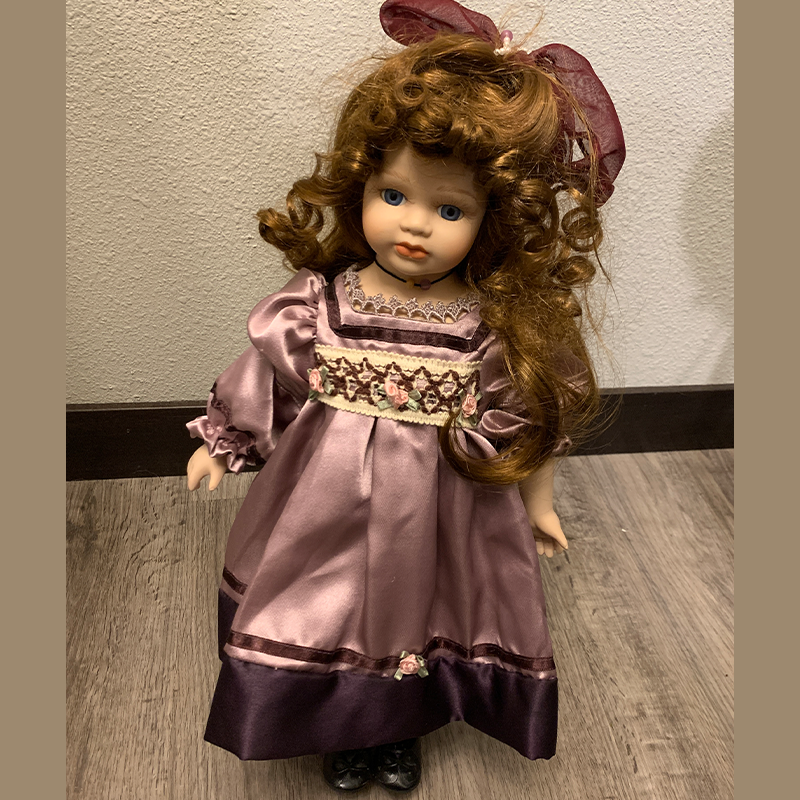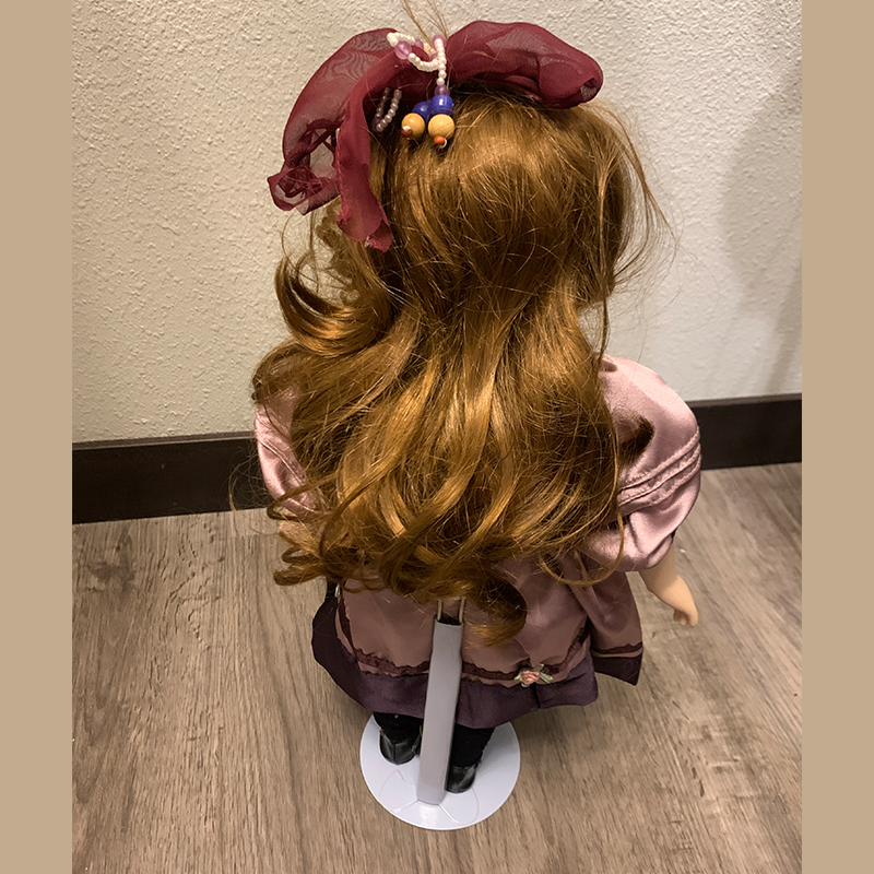 Vintage Porcelain Doll in Purple Satin Dress, 18” - Excellent Condition” Enhance your collection with this vintage porcelain doll, measuring 18 inches tall. This beautifully crafted doll features cascading curly brown hair adorned with a deep purple ribbon, striking blue eyes, and a charming expression. The doll is dressed in a luxurious purple satin dress with intricate lace and rosebud accents, paired with matching black lace-up shoes and black lace stockings. Condition: Preowned but in excellent condition, with no cracks, chips, or damage to the porcelain. The clothing is vibrant and free of stains. Please review all provided photos for a closer look at this elegant piece. Ideal for doll collectors or as a decorative addition to any room, this doll is sure to capture attention and admiration!