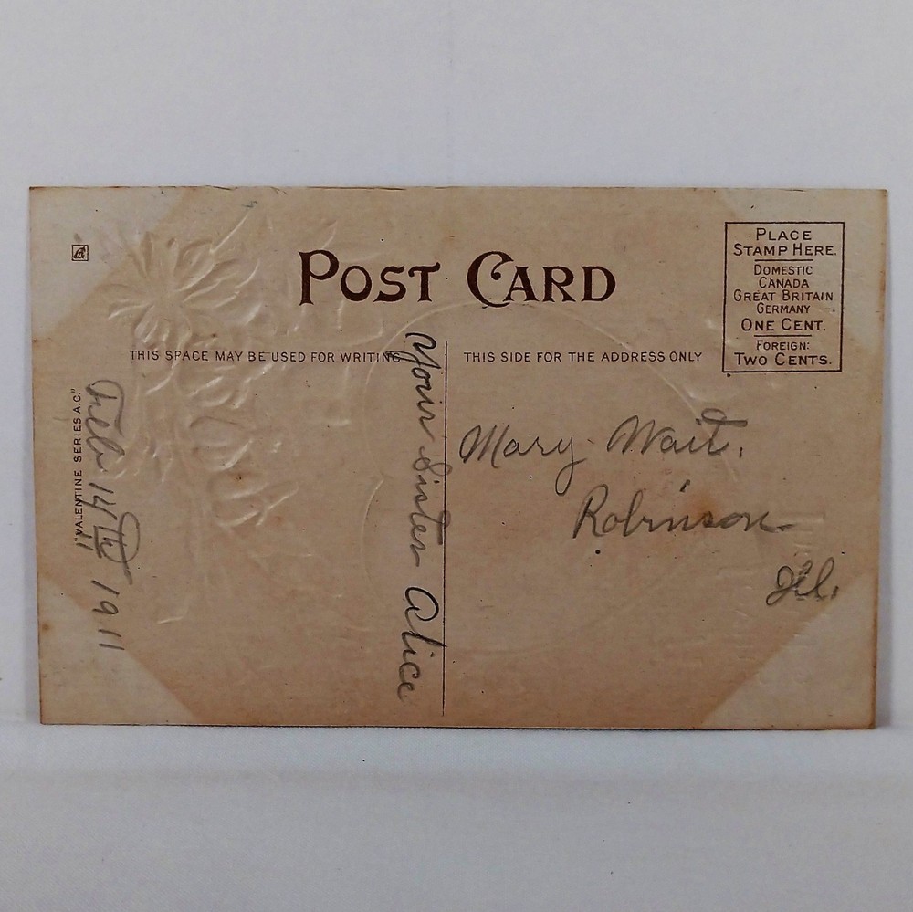 We have for sale a Vintage "A Loving Thought" Valentine's Greeting Embossed Post Card 1911. Has a little discoloration and is dated February 14, 1911. We do combine shipping on multiple items. In that case, wait for an invoice. Check out my other items ! Shipping and insurance are free. Buy It Now! Track Page Views With Auctiva's FREE Counter