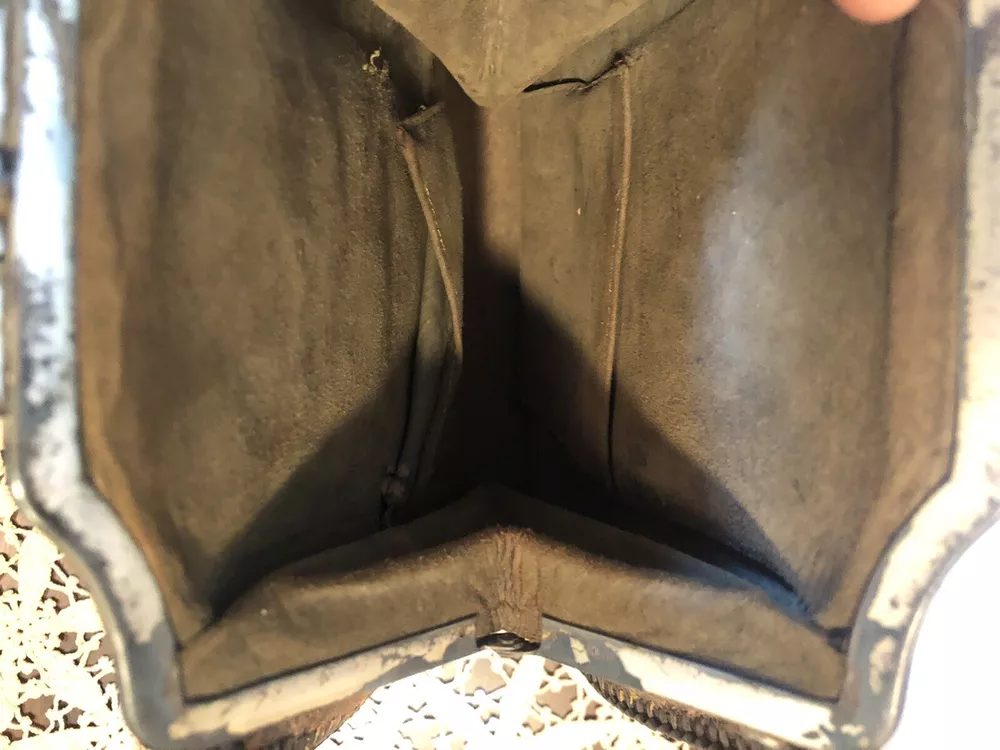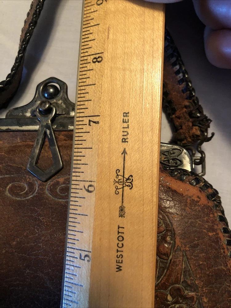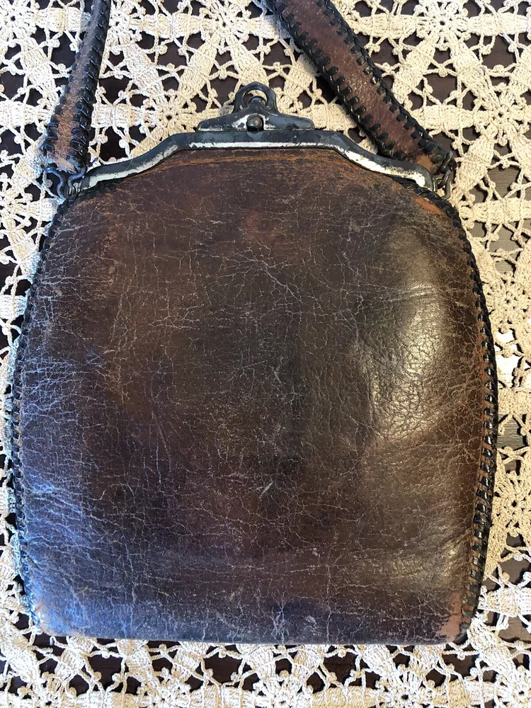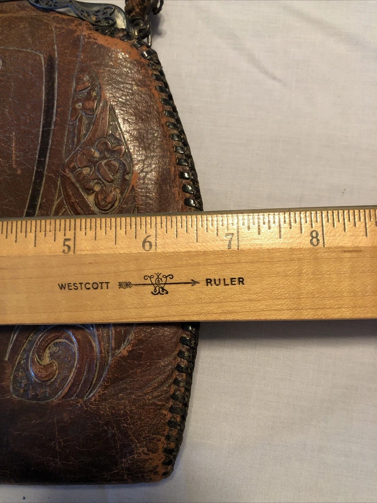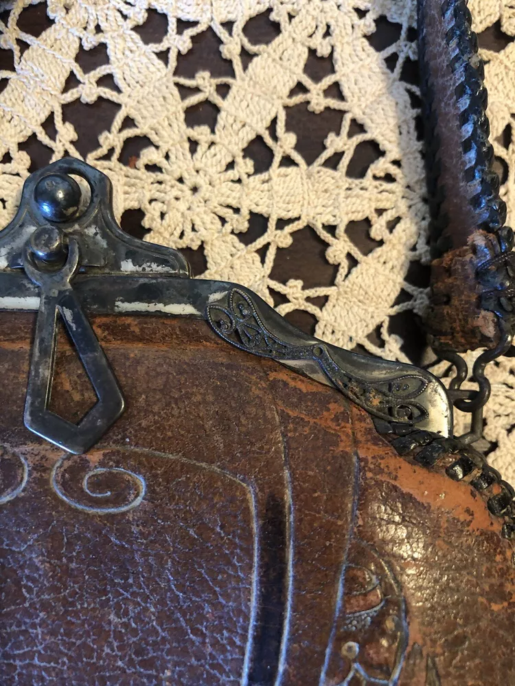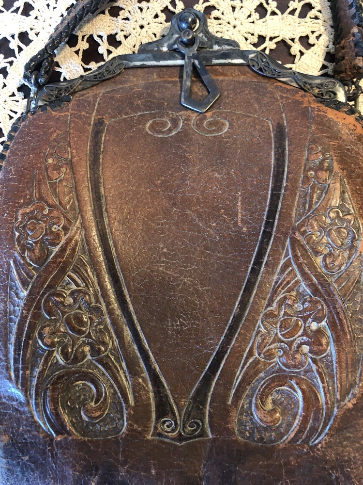 This vintage 1920's Art Deco handbag is crafted from brown tooled leather, showcasing an intricate Art Nouveau design. The purse features an intricate metal design along the closure edge and a metal art turn lock for secure closure, adding a touch of elegance to its classic style. This original piece exudes a timeless charm, perfect for everyday use or special occasions, recalling the glamour of the Roaring Twenties. It has 2 “pockets” on the inside, one pocket needs restitched on one side. On Feb-23-25 at 05:39:47 PST, seller added the following information: