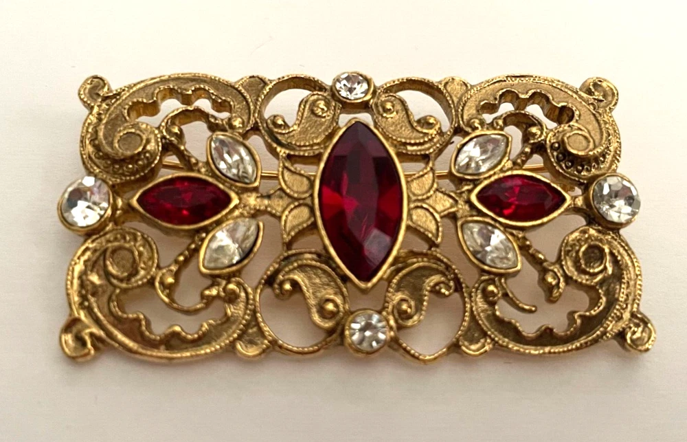 Vintage 1928 Brand Red & Clear Jeweled Brooch Lapel Pin Gold-tone 2" Jewelry #83 This is a charming vintage 1928 brand brooch. It measures 2" wide x 1" long. It is gold-tone and has red and clear rhinestones on it. This would look gorgeous for any occasion! This is a timeless and classic piece! Add it to your collection today! Please look at all photos and ask all questions before purchasing. Check back regularly as we list new items daily. Thanks for Stopping by today!