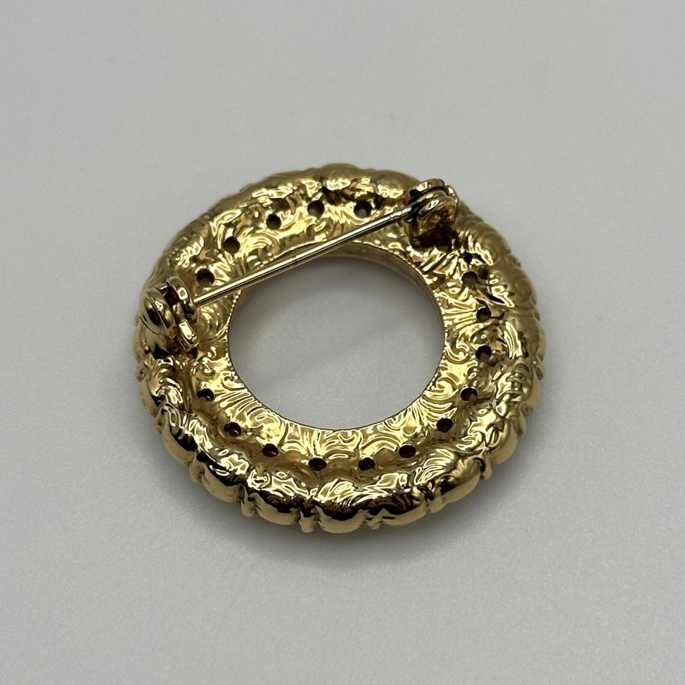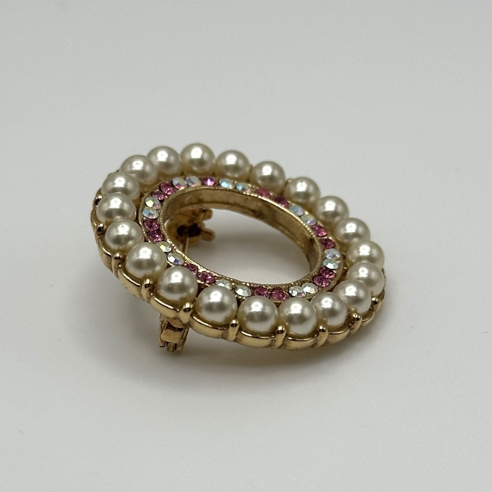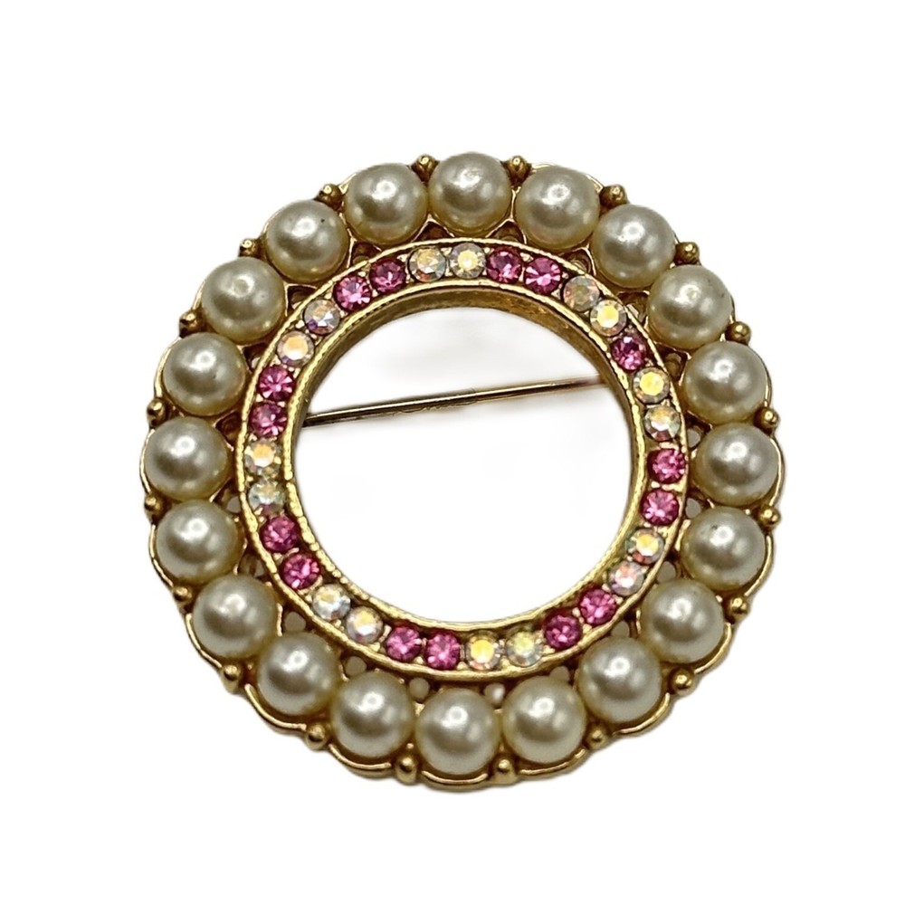 Vintage 1928 Jewelry brand gold tone circle brooch pin. Circle of pink and clear aurora borealis rhinestones surrounded by a circle of 4 mm imitation pearls. Secure locking pin back. Excellent condition.