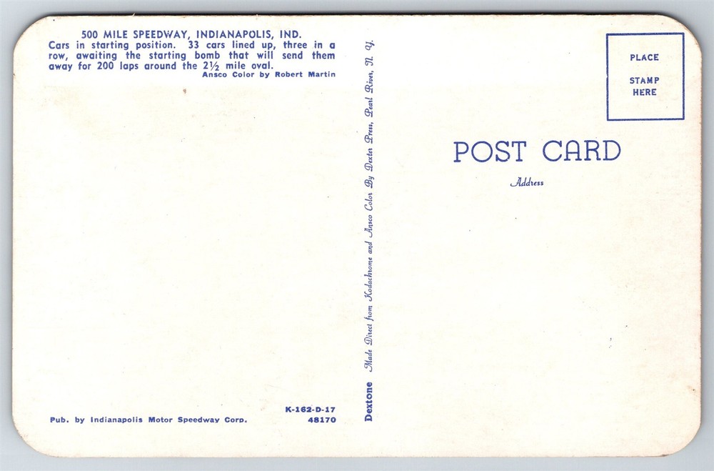 Indy 500 Int'l Speedway C1930's Race Cars Starting Straightaway Postcard U6 Thank you for visiting! This is a standard size postcard, 3.5" X 5.5". In stock, usually ships within 24 hours of your purchase. Please ask questions if you are unsure about anything. Our goal is for your complete satisfaction with the postcard and your experience. Check all my other listings in my store. RETIREDWITHBOOKS Powered by SixBit's eCommerce Solution
