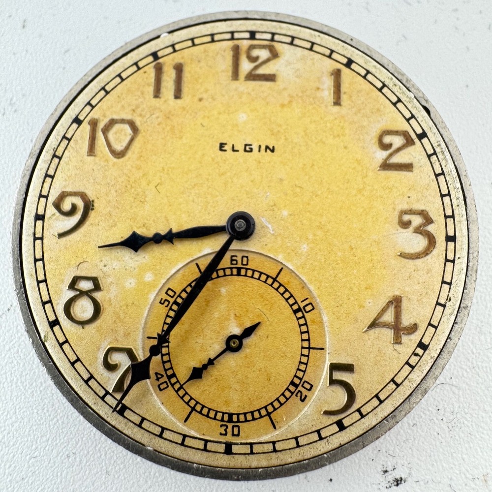 Vintage 12s 1933 Elgin 7 Jewel Mechanical Pocket Watch Movement 303 USA Product Description Item: Pocket Watch Movement Brand: Elgin Movement: Mechanical Production Year: 1933 Country: USA Jewels: 7 Jewel Gender: Men's Grade: 303 Size: 12s Product Measurements Diameter: 39.5mm Product Condition Overall Condition: Fair, overall condition for its age. Functions: Running, but may be in need of service. This means, it can run unreliably, start or stop and timekeeping is not guaranteed. Dial: The dial has scratches and discoloration. Hands: There is discoloration on the hands.