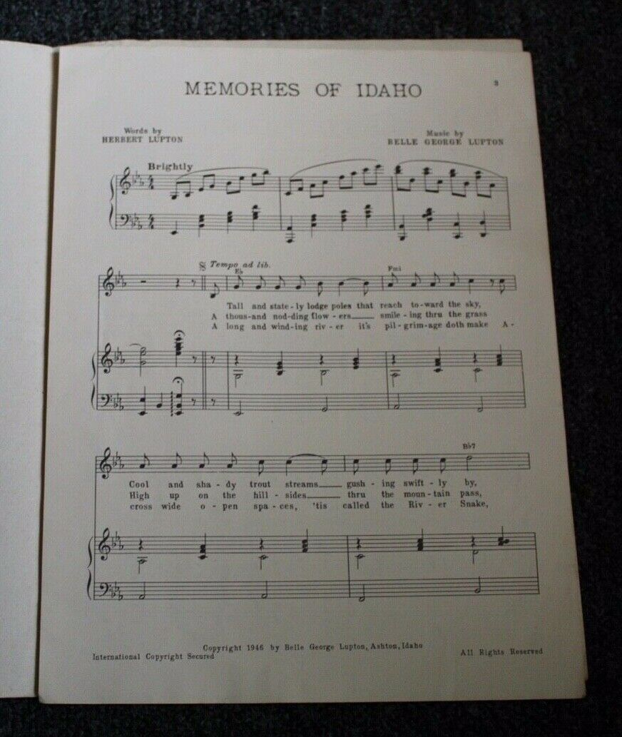 WE TRAVEL NEW ENGLAND AND BEYOND TO PICK UP LARGE COLLECTIONS TO FEATURE HERE FOR YOU ON EBAY! Vintage 1946 sheet music titled "Memories Of Idaho" with words by Herbert Lupton and music by Belle George Lupton, who signed it.....measures 12 inches by 9 inches....good condition with light wear WE HOPE YOU ENJOY THE WIDE VARIETY AS WELL AS SOME VERY HARD TO FIND ITEMS.....NON SMOKING HOME ADD US TO YOUR FAVORITES LIST! YOU WILL NOT BE DISAPPOINTED AS WE PRESENT WEEKLY A WIDE VARIETY OF UNIQUE ANTIQUE AND VINTAGE ITEMS. OVER 200 ITEMS A WEEK! WE USUALLY START OUR ITEMS AT $9.99! WE REQUEST THAT PAYMENT IS MADE WITHIN 3 DAYS THANK YOU! WE DO NOT PUT LOWER VALUES ON CUSTOM FORMS. WE ARE NOT RESPONSIBLE FOR ANY FEES, DUTIES OR TAXES YOUR CUSTOMS/COUNTRY IMPOSES. WE RESPECTFULLY REQUEST THAT YOU CONSIDER THE COST OF SHIPPING BEFORE YOU PLACE YOUR BID