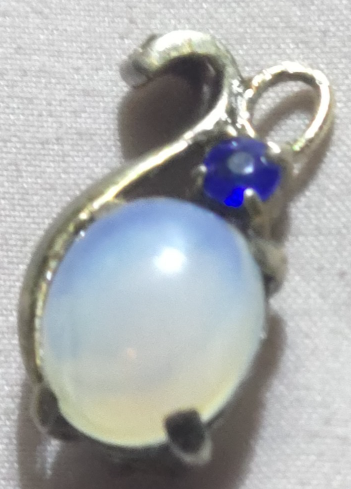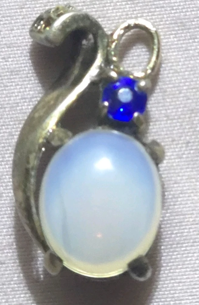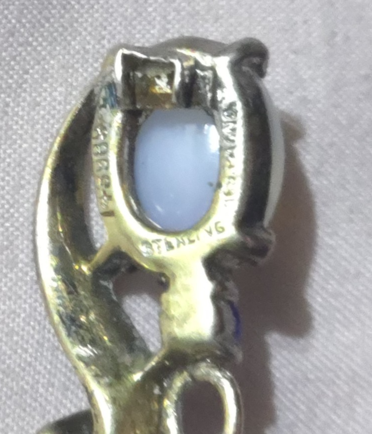 Patent No 143989 The product is a vintage Alfred Phillippe Trifari 1946 Sterling Jelly Belly Moonstone Pendant, measuring 1 inch in length. It is signed by Trifari and made of sterling silver with a prong setting style. The main stone is a white/colorless moonstone in a cabochon shape. This pendant is a stunning piece of vintage jewelry for women, with a classic and elegant design that showcases the beauty of the moonstone gemstone.
