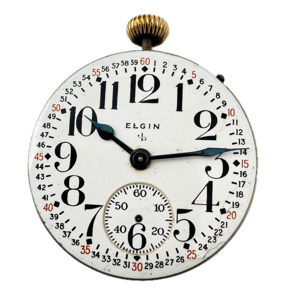 Vintage 16s 1947 Elgin Montgomery 17 Jewel Pocket Watch Movement 573 USA Product Description Item: Pocket Watch Movement Brand: Elgin Model: Montgomery Movement: Mechanical Production Year: 1947 Country: USA Jewels: 17 Jewel Gender: Men's Grade: 573 Size: 16s Product Measurements Diameter: 43mm Product Condition Overall Condition: Poor, overall condition for its age. Functions: Not running, the Balance staff is broken. Dial: The dial has hairline crack(s) on it. Hands: It is missing the second hand. There is discoloration on the hands.