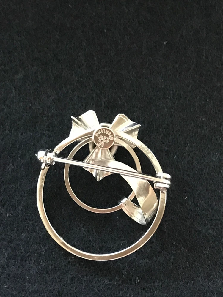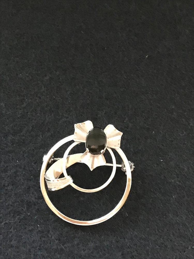 This vintage brooch from the 1950s is crafted from sterling silver and features a striking black onyx stone as its main centerpiece. The brooch has an antique charm to it, making it a unique and timeless piece of jewelry. With its classic design and quality materials, this Sterling DCE brooch with Onyx is a beautiful accessory that adds a touch of elegance to any outfit.