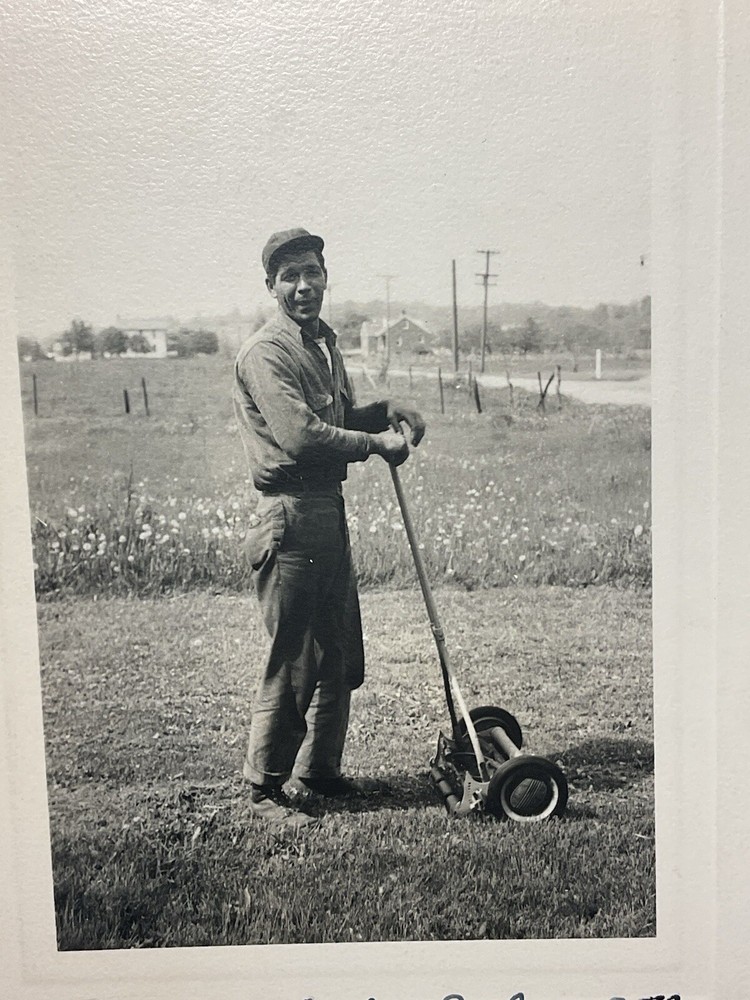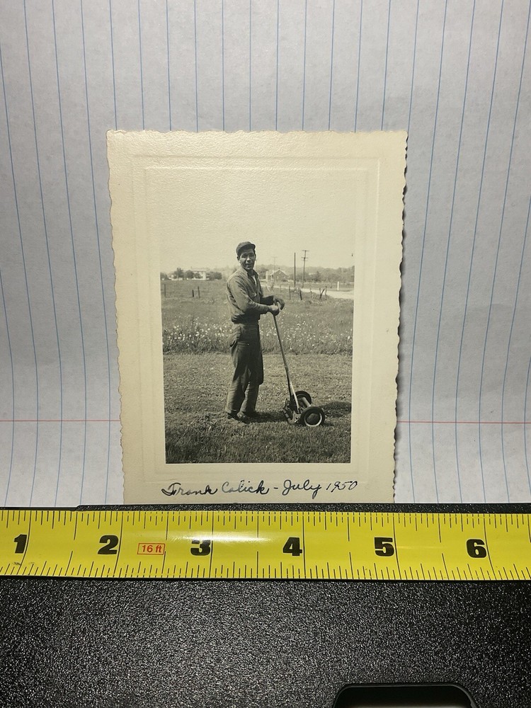 Vintage 1950 Photo of Man Pushing Lawn Mower in Yard by Frank Calick S1225