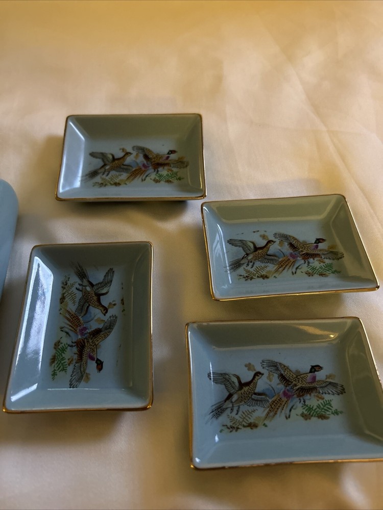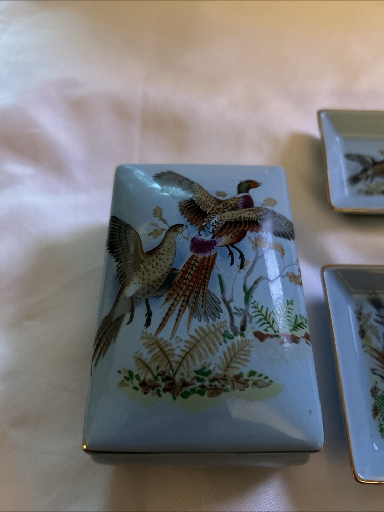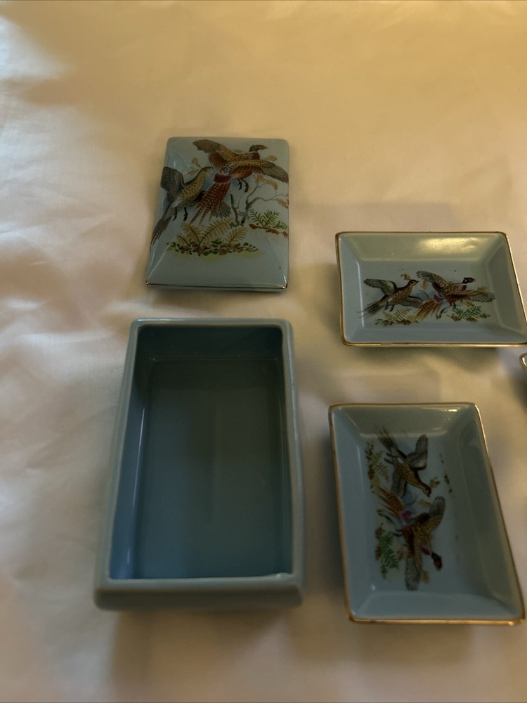 Time Period Manufactured:1950-1959Color:BlueCharacter:pheasantSize:4.5x 3inType:Trinket BoxFeatures:BoxedCountry/Region of Manufacture:JapanStyle:1950sOccasion:All OccasionsTheme:WildlifeSubject:Pheasants, BirdsMaterial:Ceramic, PorcelainCollection:AnimalsBrand:ATCShape:RectangleFinish:GlossyPattern:Pheasant