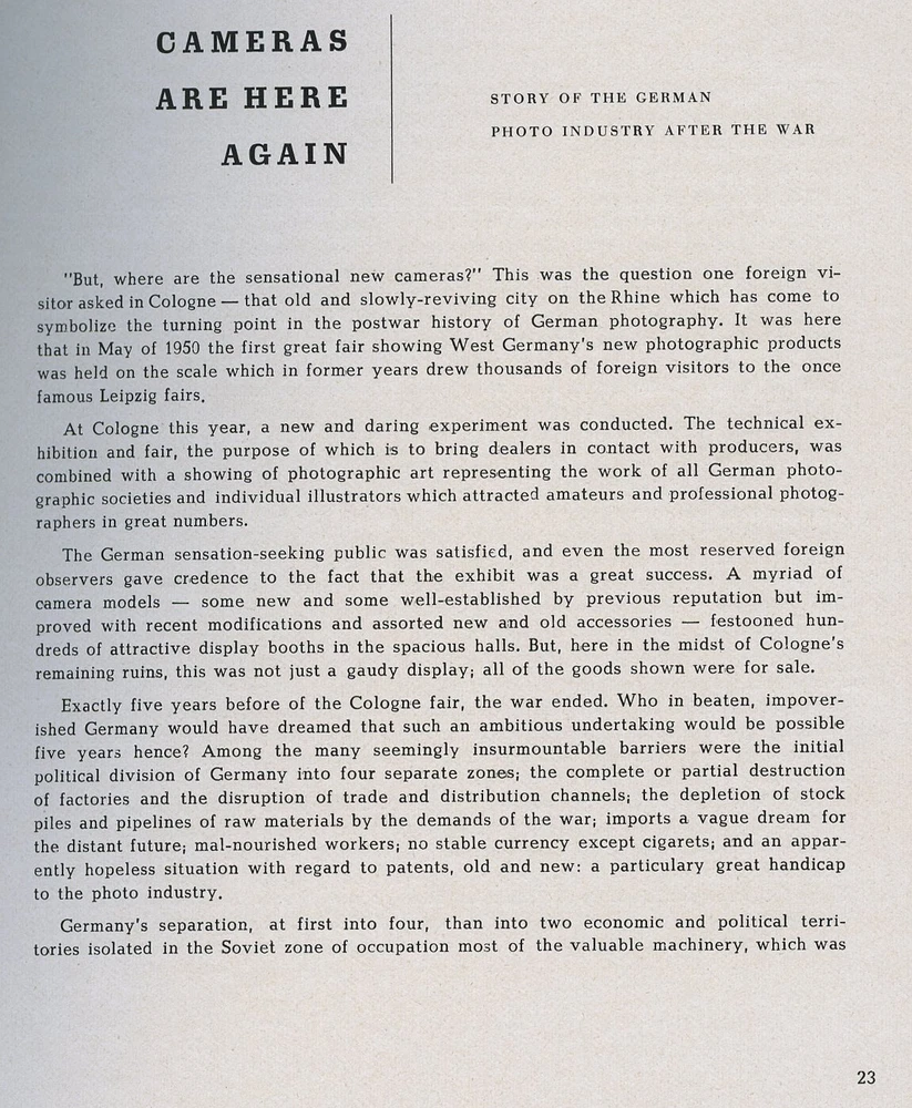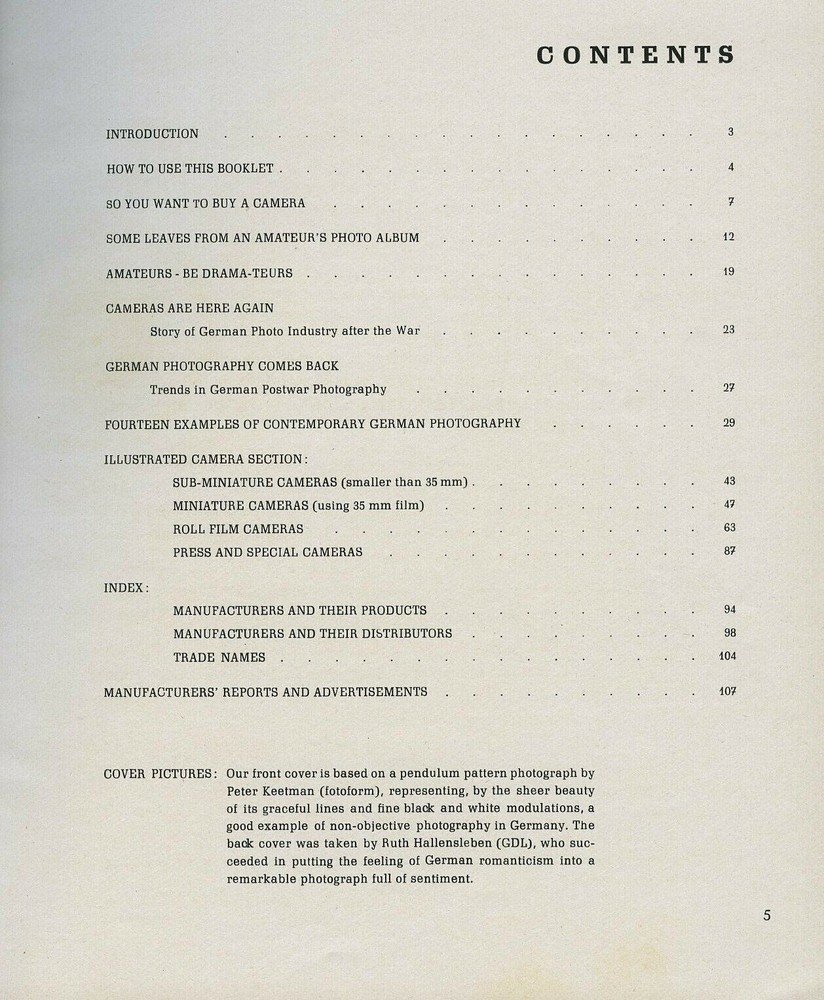 A special 157 page book about the many German products marketed to the photo industry in the 1950's. If you have interest in those many great German photo companies from those glory days of film (analog) photography, great companies like Zeiss, Minox, Rollie, Agfa, Leica and many others are covered in this book. The opening chapters cover info on how to take better pictures and all things that pertain to using your camera more accurately to obtain better results. Many of the later chapters cover the latest products from many of those leading German photo manufactures. Great reading and useful info for anyone who likes to collect those great German cameras from years long ago!