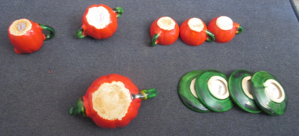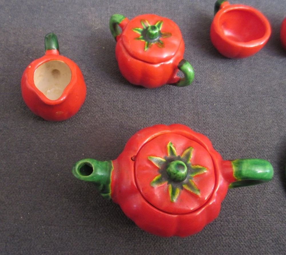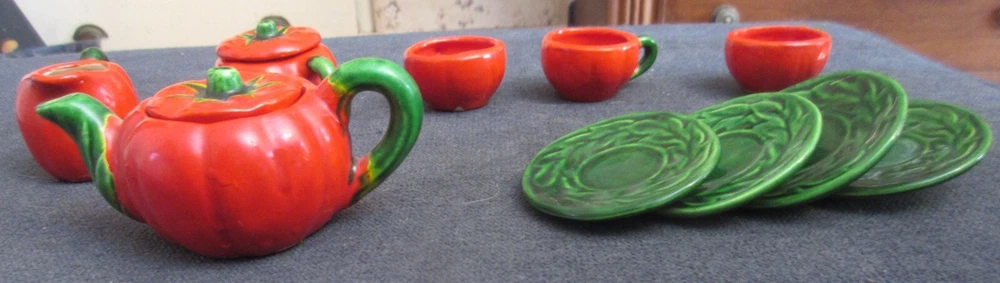 This is a Vintage 1950's Japan Tomato Ware Partial Tea Set. Included are 4 tea green tea saucers, 3 red tea cups, 1 teapot, 1 creamer and I believe 1 container for sugar. Pre-owned but the pieces are in EXCELLENT condition. See pictures for best description. All questions welcome ahead of time to avoid confusion later. This item has been in a smoke free/ climate controlled home. Thanks for looking. sjc