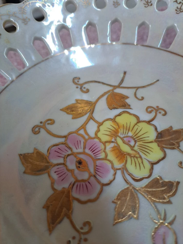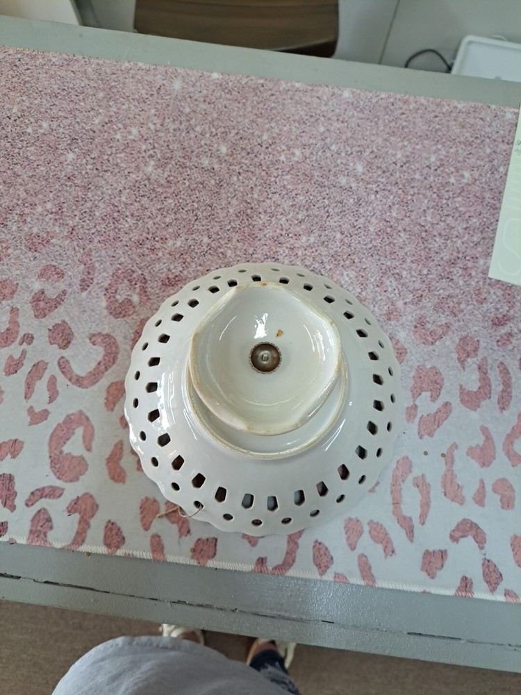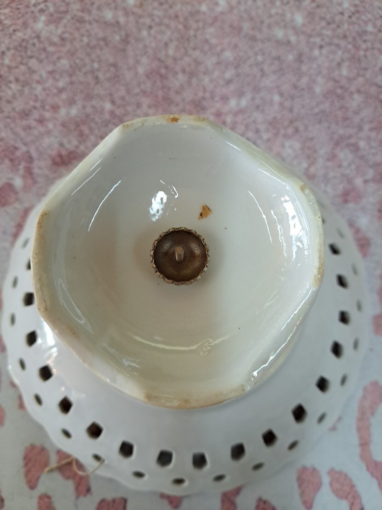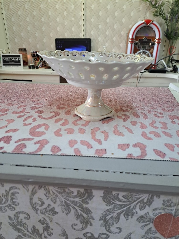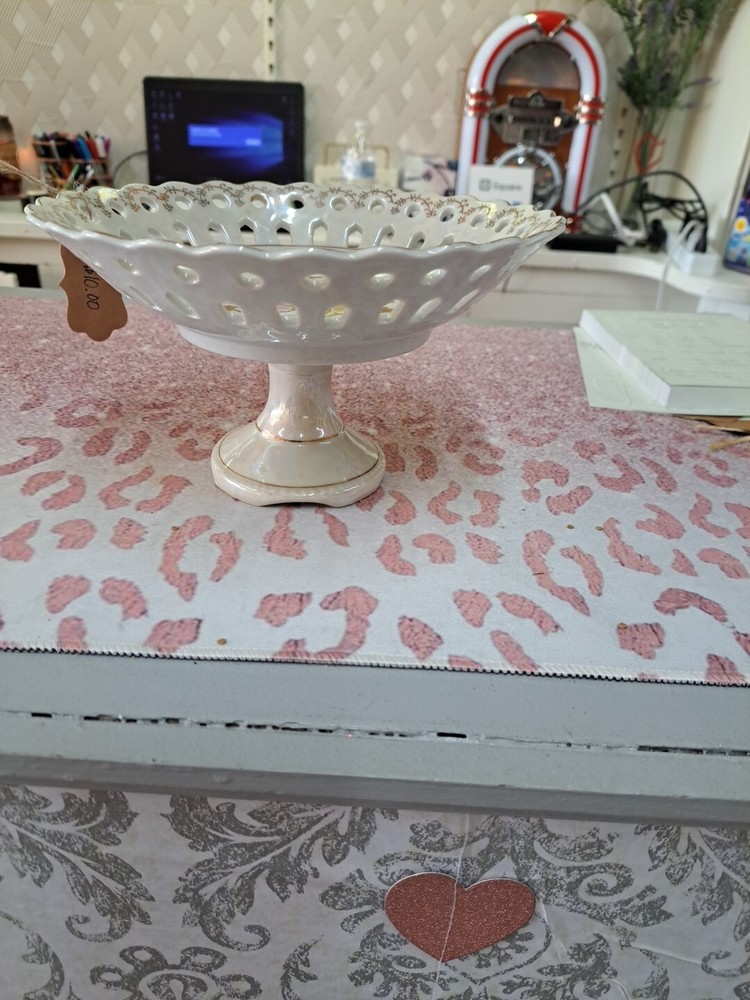 This vintage 1950s porcelain pedestal compote dish features a floral pattern on a round shape with a glossy white finish. Hand-painted and made of porcelain, this candy dish exudes a classic charm perfect for displaying sweets or small treats. The unmarked dish showcases art pottery production style with a flower theme, making it a delightful and elegant addition to any home decor with its vintage appeal.