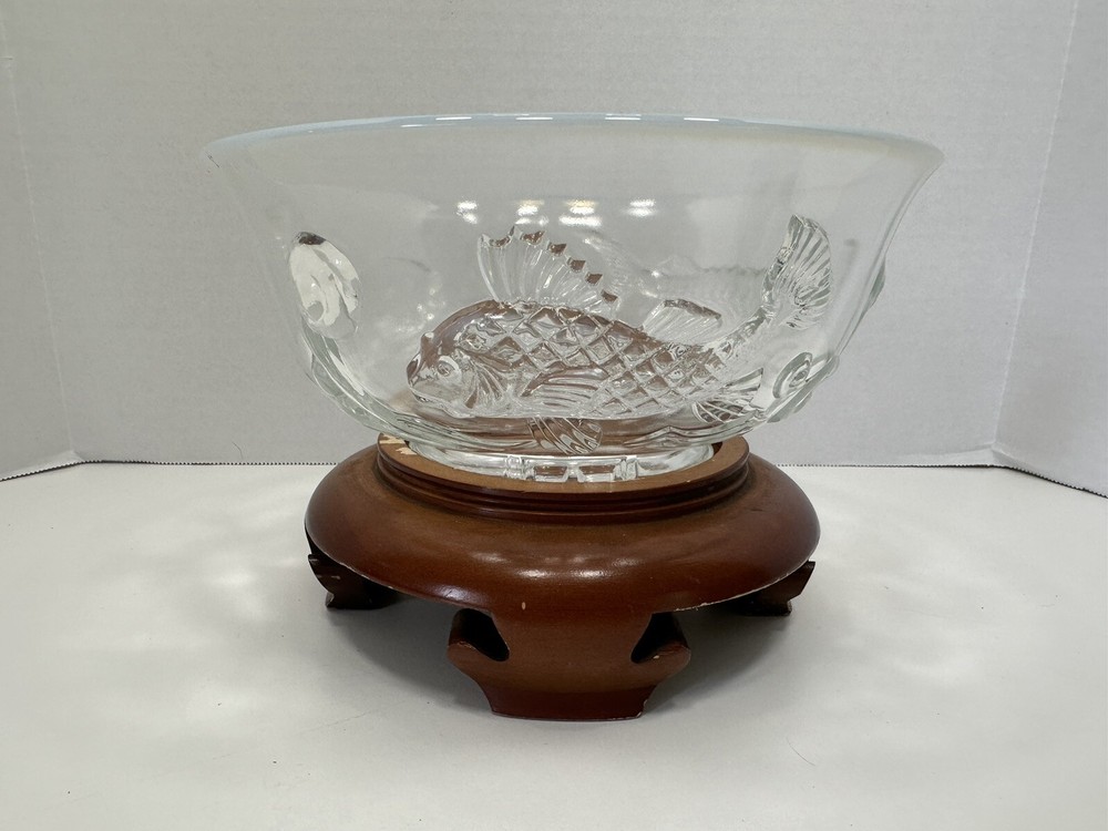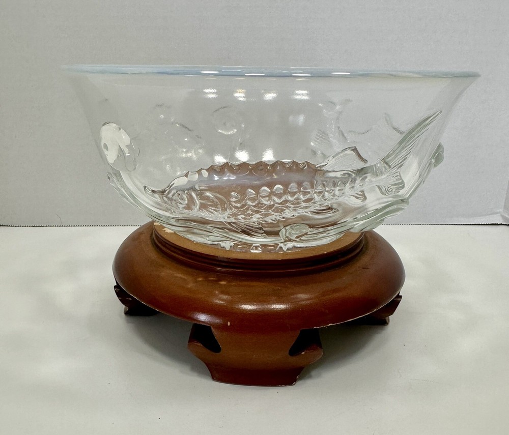 Comes with wooden stand. A couple flea bites on the bottom rim. No cracks or chips. This Bowl was designed as a special Christmas edition and was sold for the 1950 Christmas season. The three fish represent, Carp, perseverance. Perch, wealth and Sturgeon representing distinction. Ted Mehrer went on to work for Fenton Glass Company. There are light scratches on the interior from use but no chips or damage. It appears this is a Ted Mehrer Verlys of America "Round Fish Bowl" mold struck by Fenton or Holophane - most likely Holophane as it is in french opalescent.