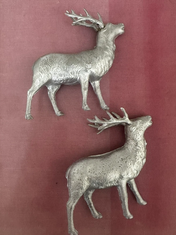 Charming and lovely, vintage 1950s or early 1960s celluloid silver reindeer. They each measure 3” 3/8 tall by 3” 1/2 inches wide. They’re in used condition with some flaws. One of the reindeer has a repaired antler on the left side. It’s secure but sticks out a bit. There’s also some silver paint loss on the middle of its body. There’s a bit of glue residue near the repaired reindeer’s antlers. The other deer has some minor paint loss as well. Each are marked Japan on the bottom of them. Selling as is/as found. A fabulous new addition to your classic holiday decor. Offering free shipping. Thanks for your interest!