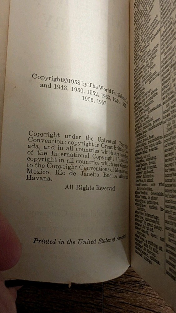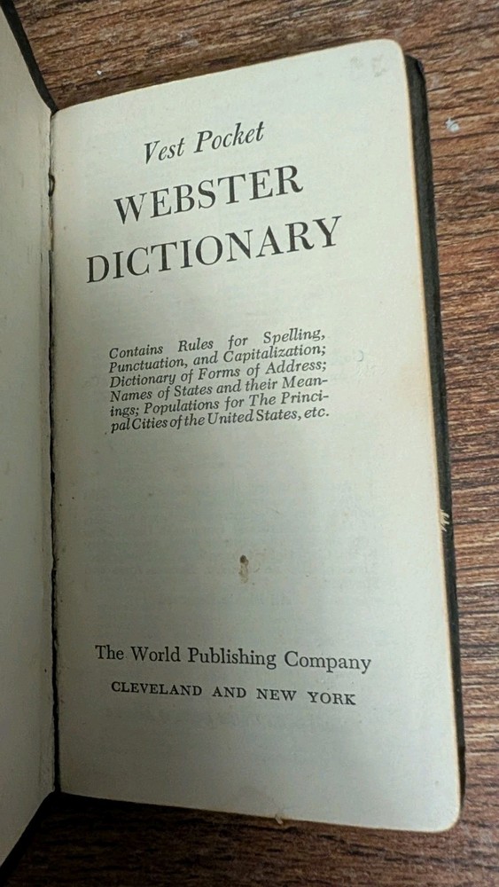 This vintage collector's vest pocket Webster's Dictionary from 1958 is a must-have for any avid collector or lover of reference books. The leather binding adds to its charm and durability, while the self-pronouncing feature makes it a useful tool for anyone looking to improve their English language skills. The dictionary was published by The World Publishing Company and authored by an unknown individual. It falls under the categories of Books & Magazines and Antiquarian & Collectible. The original print year of 1958 adds to its vintage appeal. This item is perfect for those interested in dictionaries, thesauri, and reference subjects.