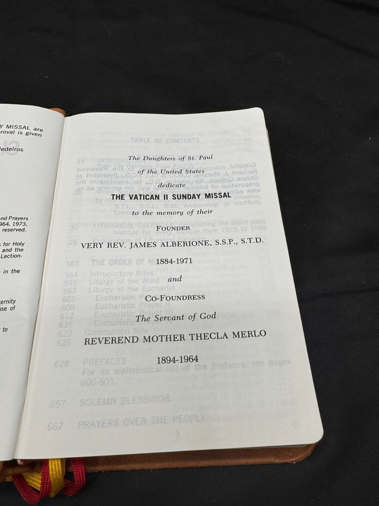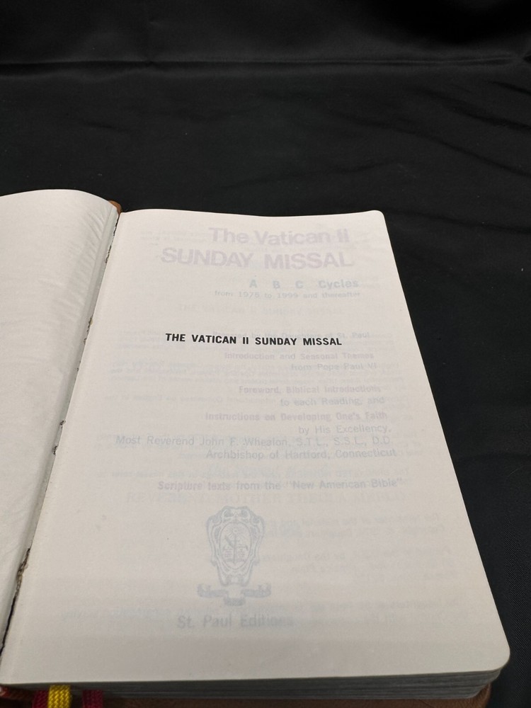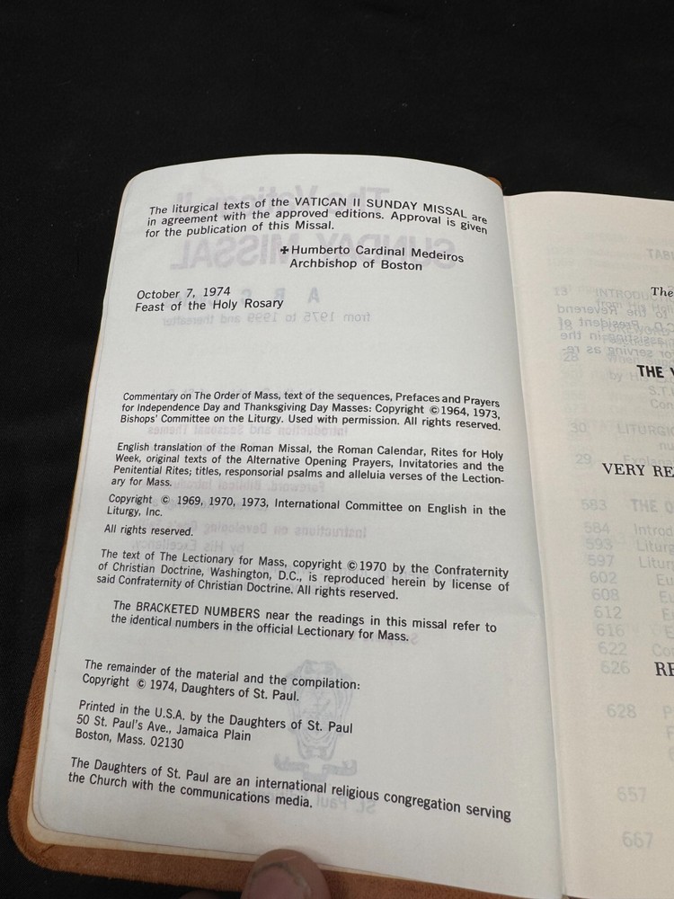 Vintage 50yo Vatican II Sunday Missal Leather Bound by the Daughters of St. Paul 1974 The liturgical texts of the raved editions. pAY MISSAL are in agreeiatich of this Missal. etions. Approval is given for the publication of this Missal. + Humberto Cardinal Medeiros Archbishop of Boston October 7, 1974 Feast of the Holy Rosary