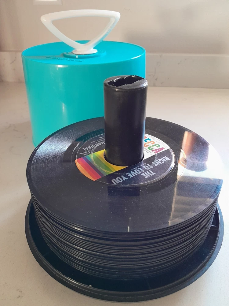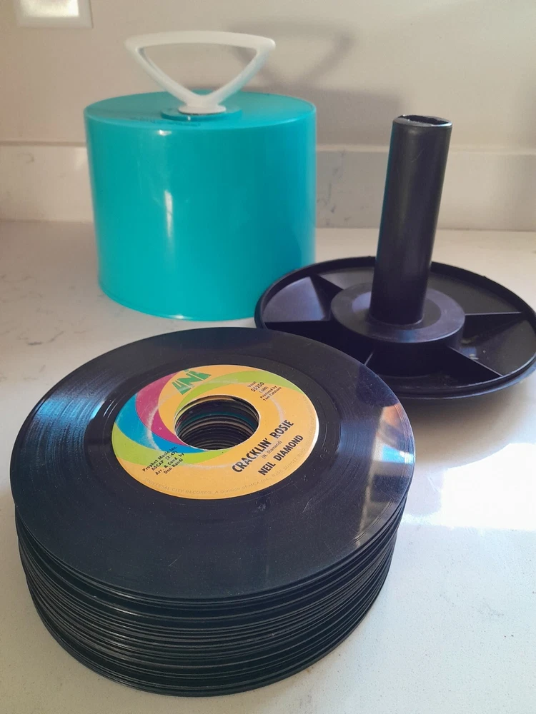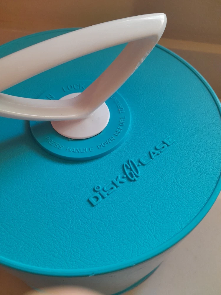 This vintage 1960s Disk Go Case is a durable and stylish option for carrying your 7" records. The blue plastic material and Supronics branding make for a unique and fashionable look. The case is designed to fit 45 RPM records and is perfect for any music enthusiast or collector. Made in the United States, this case is built to last and will provide a secure and protective environment for your valuable records. The Disk Go Case is a must-have accessory for anyone looking to keep their records organized and safe. Comes complete with half full 1960s 45 records! Great Condition. One small flaw on handle as Shown.