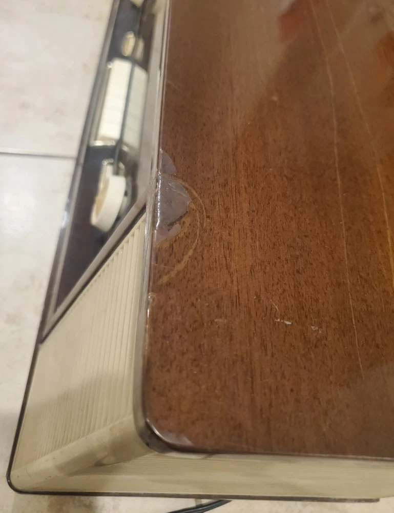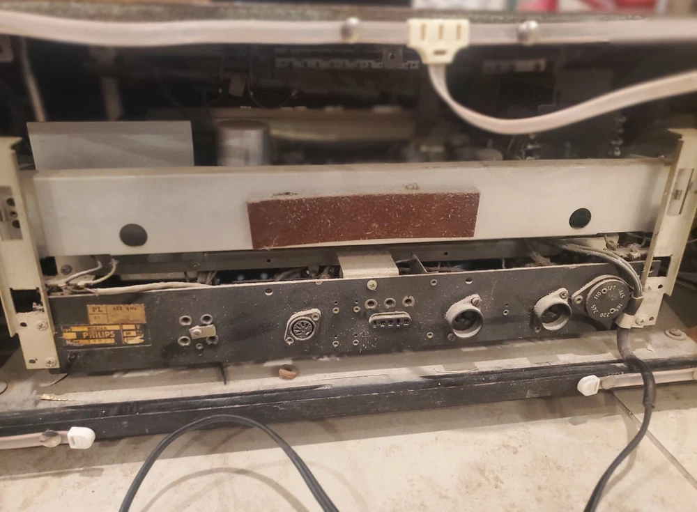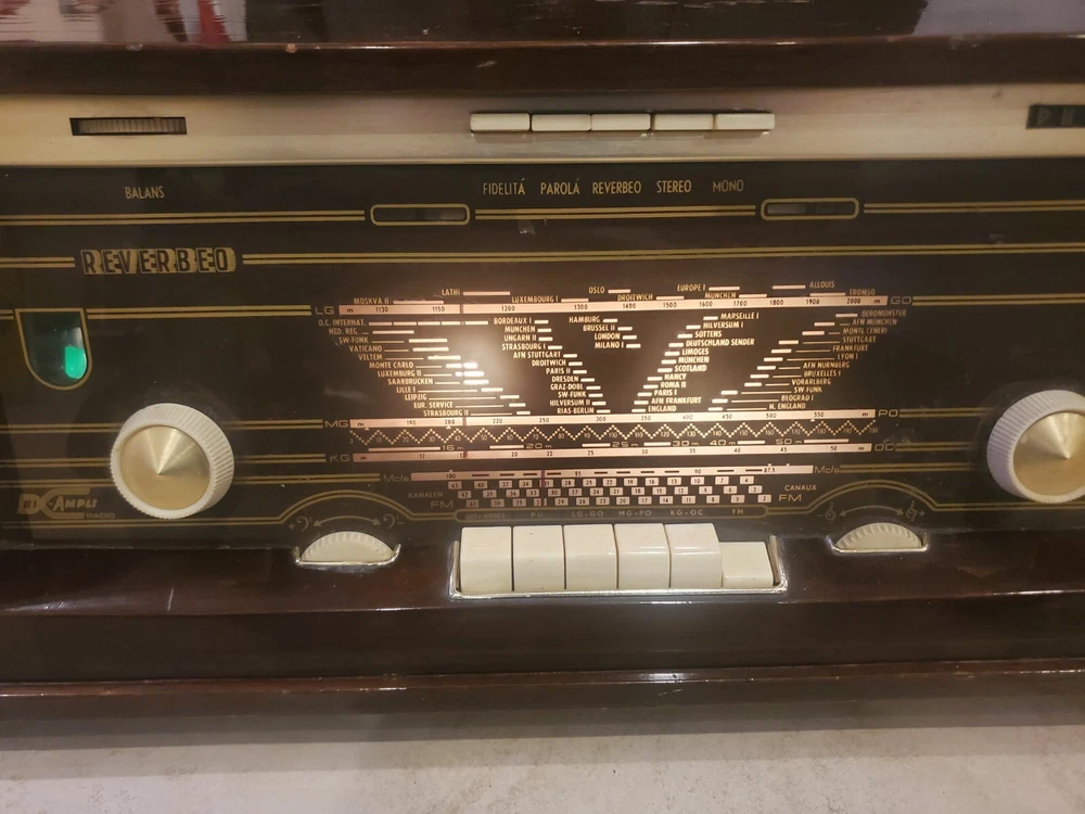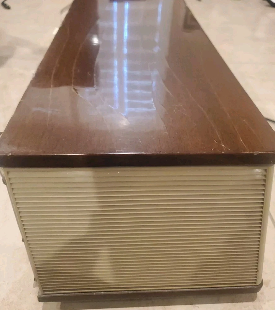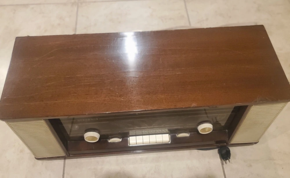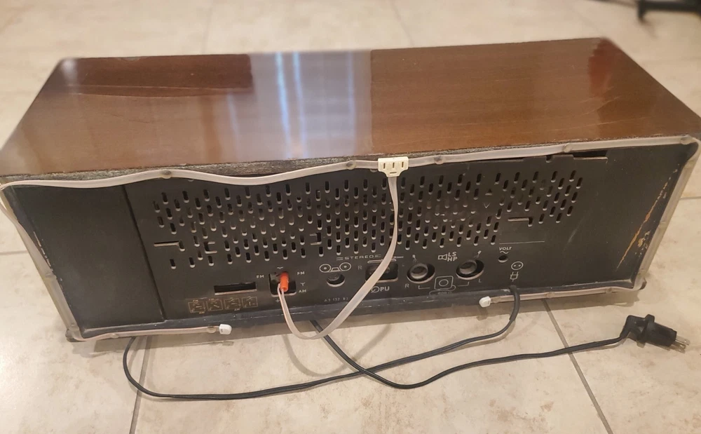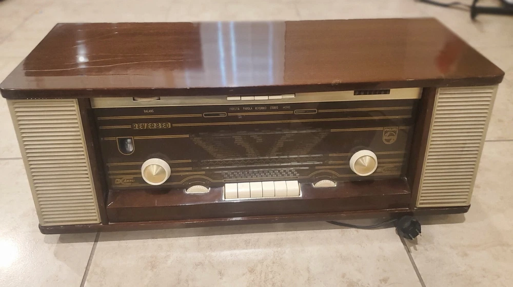 Vintage 1960s Philips Bi-Ampli 4 Band FM/AM STEREO Tube Radio B7X14A Reverbeo (Tested) Condition is Good to Fair Vintage and works. Has the ability to play AM/FM radio. Pressing the top sound adjustment buttons, I can hear slight differences in radio tone. Fidelita and Parola buttons makes some squeaking staticky sounds, while the Reverbeo amplifies the bass sounds. Pressing Stereo and Mono top buttons don't seem to make any difference in the sound. So I would assume that some tune up by a radio expert needs to be done on certain top sound buttons. This was an estate find, and I'm describing as best to my knowledge. Please watch the video. There is some chipping on the wood and dusty interior. All the parts inside look original and old. Aside from some a few issues mentioned, radio works very well. With the right parts and a professional technician, this can easily be fully refurbished. Philips "Bi-Ampli" 4-band FM/AM STEREO tube (valve) radio B7X14A 10 tubes - 2 speakers - stereo amplifier - reverb spring - EL backlit dial - desirable collectable - great sound Make and model Philips, B7X14A/64, Made in Holland, 1961-'63. Top of the line model; very hard to find this /64 version. Features include, Macore hardwood veneered cabinet with high gloss finish Large, EL (electro-luminescent) backlit station dial with separate pointers for AM and FM ranges LW/MW/SW/FM bands. FM frequency range ca. 87.5-104 Mhz Ten tubes: ECC85, ECH81, EF89, EBF89, EM80, EAA91, ECC83, 2x EL84, EZ81 Reverb (echo) spring for enhanced 'Concert Hall' sound Tape and Phono inputs (stereo!) Stereo amplifier with two Philips 800 Ohms double-cone AD3800AM speakers Volume control, bass and treble tone control knobs, push button tone control presets ('Fidelita', 'Parola'). Balance control thumb wheel, mono/stereo and Reverbeo push buttons. Built in ferroceptor antenna for MW/LW reception, connectors for external FM and AM antennas. 'Magic eye' fluorescent tuning indicator.
